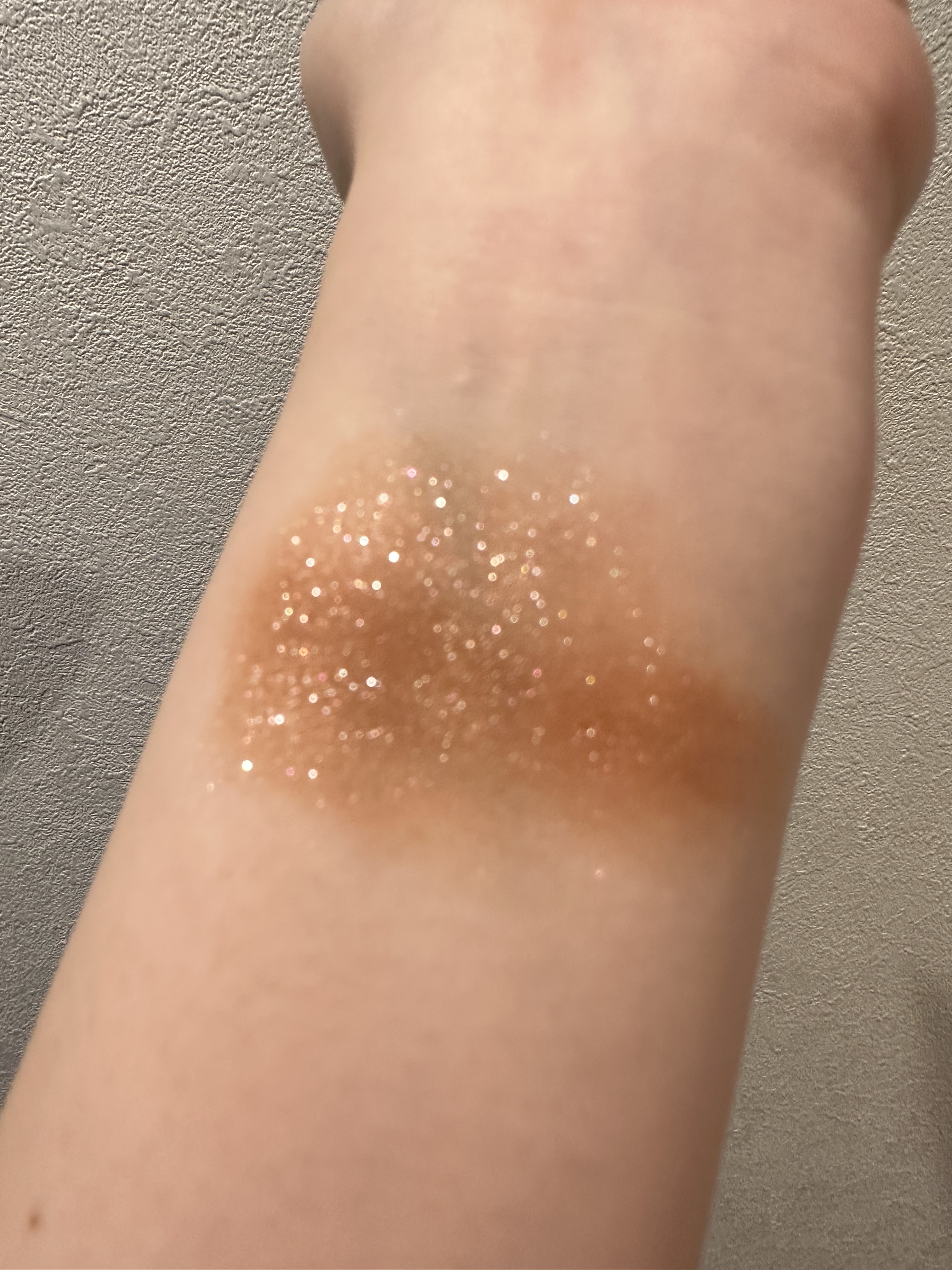 アプリコット系というか くすまない明るいブラウンで ラメも多色で入ってるんだけど 粉質はめっちゃしっとりで 私の大好きなこってりしっとりなの(笑) しっかり発色もしてくれるし ブラシでも指でも乗せやすいし ちょっとしたお泊まりとか旅行では これ一個あればちゃんとメイクしてる感は出せる✨ 出たら3個はストック買いしたい😂