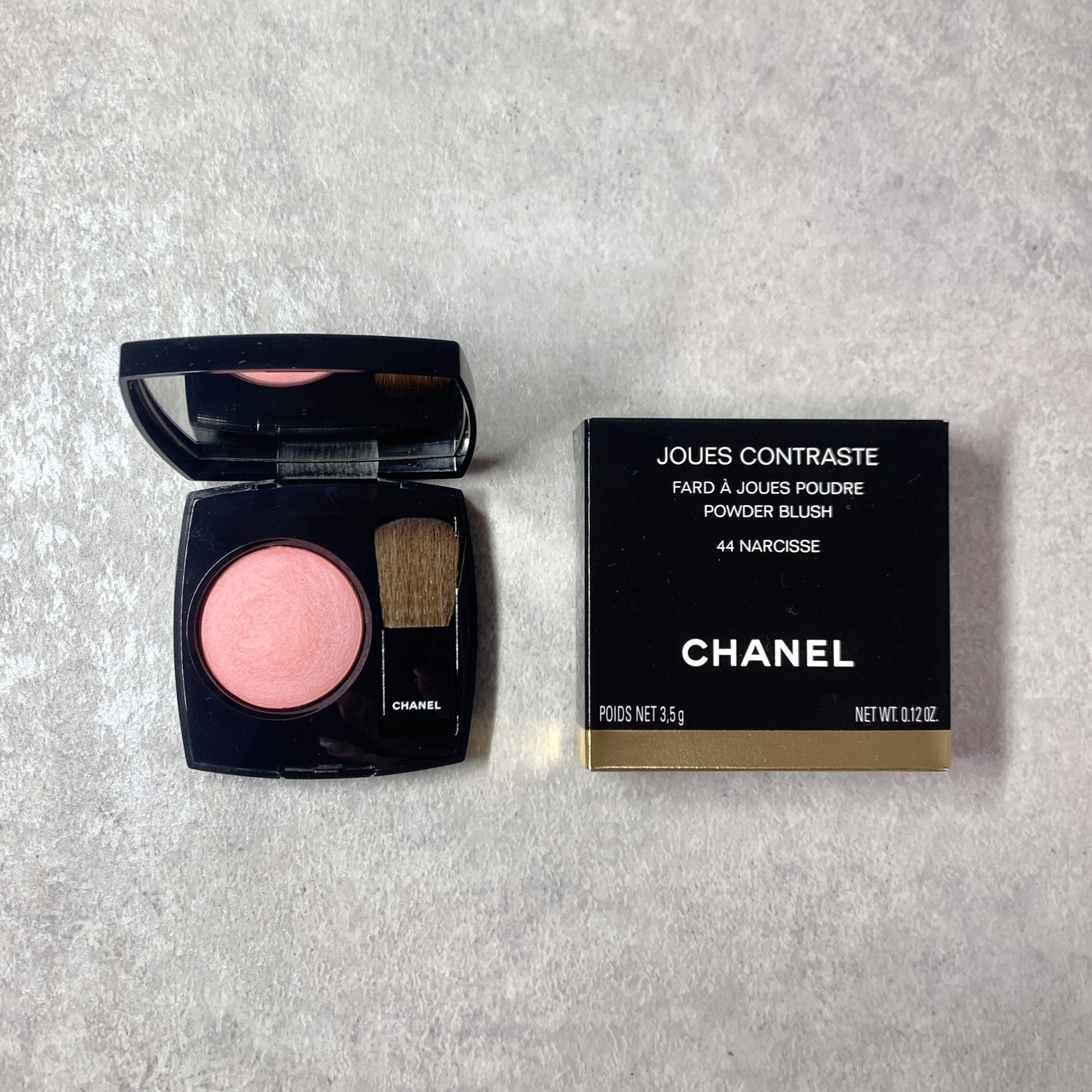 CHANELジュコントゥラスト44ナルスィスくすみのない柔らかな桜ピンク🌸肌が明るくなる色です。焼きチークって粉質固めかと思ってたけど、ブラシでフワッと取っても意外と量が取れました。なのでつけすぎないように注意。塗ってる感がないのにポワッと血...