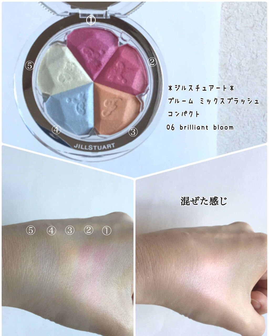 ♡JILLSTUART♡持ち運びに便利なブラシ付き💘ミックスブラッシュコンパクトN06porcelainflowerオレンジが入っているので肌なじみの良いカラーだと思いますくるくるっと4色ミックスさせて使ったり単色でも使えるので便利です!ブラシでとる時に若干粉が飛ぶのが気になりますが、頬に乗せるとふわっと発色してくれるし持ちもいいです、なんというか粉っぽさが無くなります!とてもおすすめのチークです(*˙˘˙*)❥❥