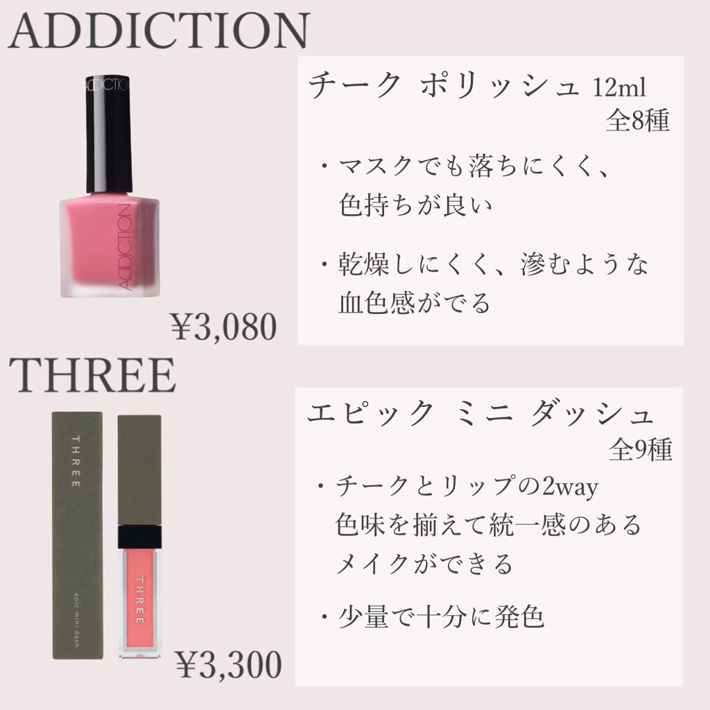 threeエピックミニダッシュサラッとしていて付け心地がよくあまりヨレないので重宝しています。単色で使ったり混ぜて使ったりしてます💕04D:LOVEREACTIONパッションピンクです😊オールシーズン使ってます。つけたら可愛すぎないピンクです...