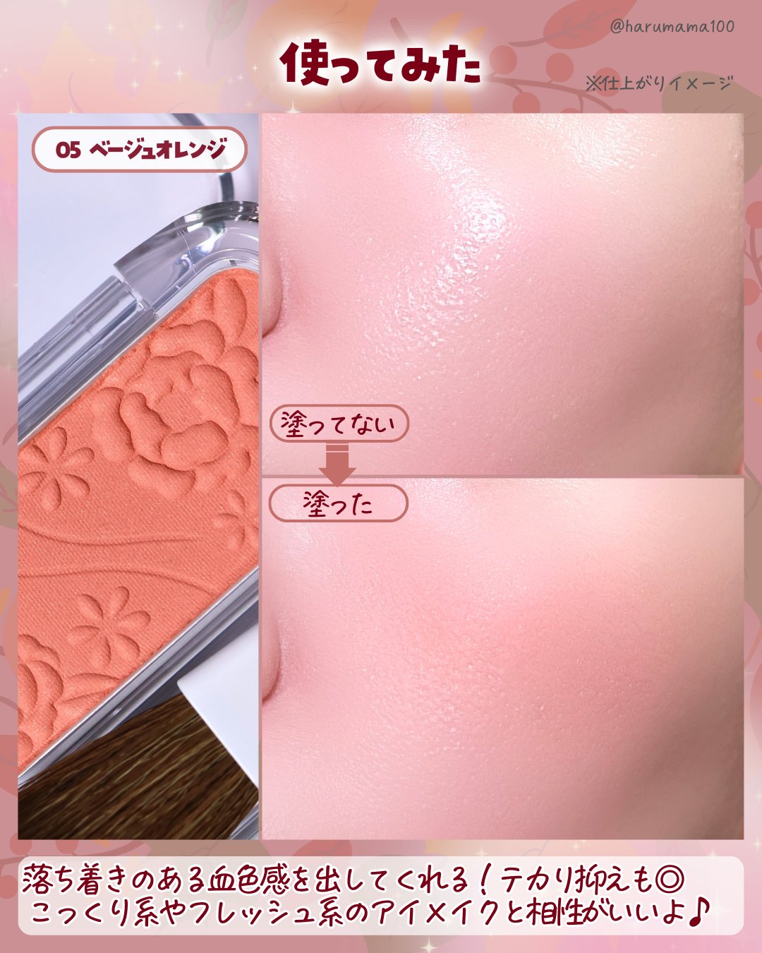 05 ベージュオレンジ のカラーはラメが入っており、ふんわりのせるとラメが光に反射して上品に見えます! 濃いめにハッキリのせると、可愛らしい感じになります! 個人的に、目の下の頬の中心あたりに入れるのが、可愛らしい印象になって良いと思いました💓