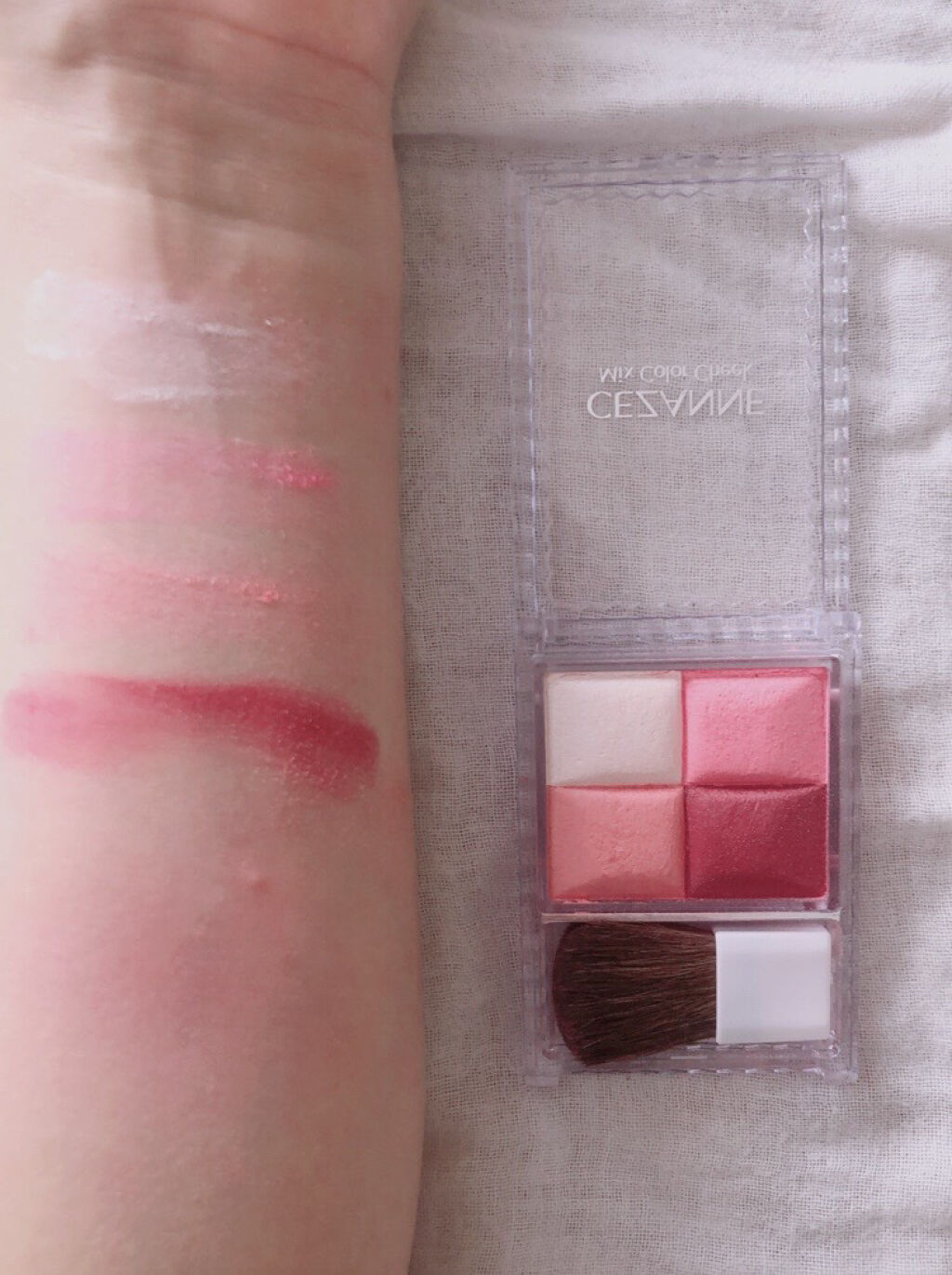 セザンヌミックスカラーチーク04ローズ系です💓右下の秋にぴったりの色が気になって購入しました(*⁰▿⁰*)手に塗った色は左上から右回りに2度塗りした発色です!!1番下の色は全部混ぜた色です!!ラメもちょうどいいくらいなので使いやすいと思います...
