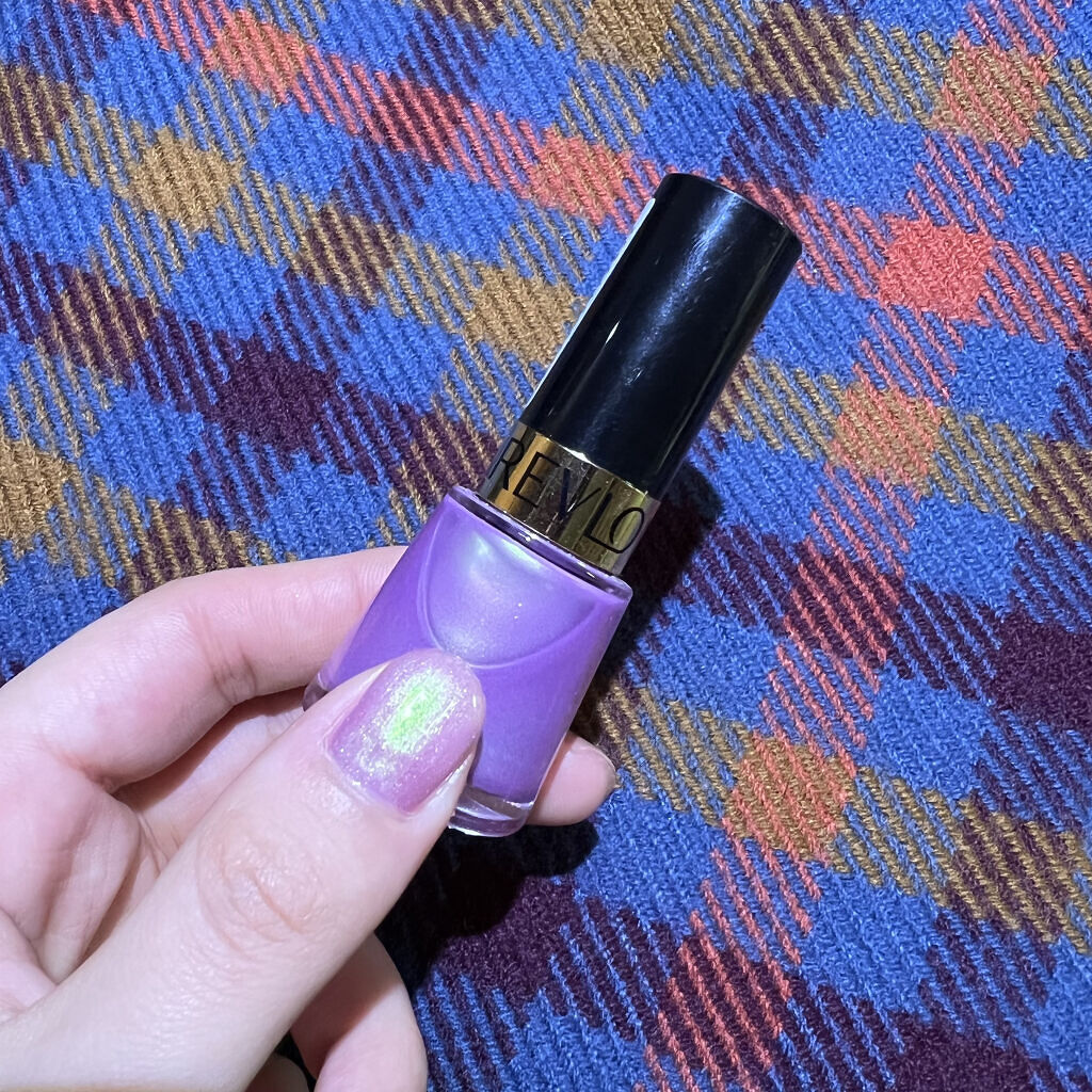 紫色ですが、一度塗りだと貝殻の内側みたいな薄ピンクの偏光カラーになります🥳 手元がとても綺麗に見えるのでお気に入りです! あと、レブロンのネイルポリッシュは、乾くのが早いのでとても楽ちんです😳