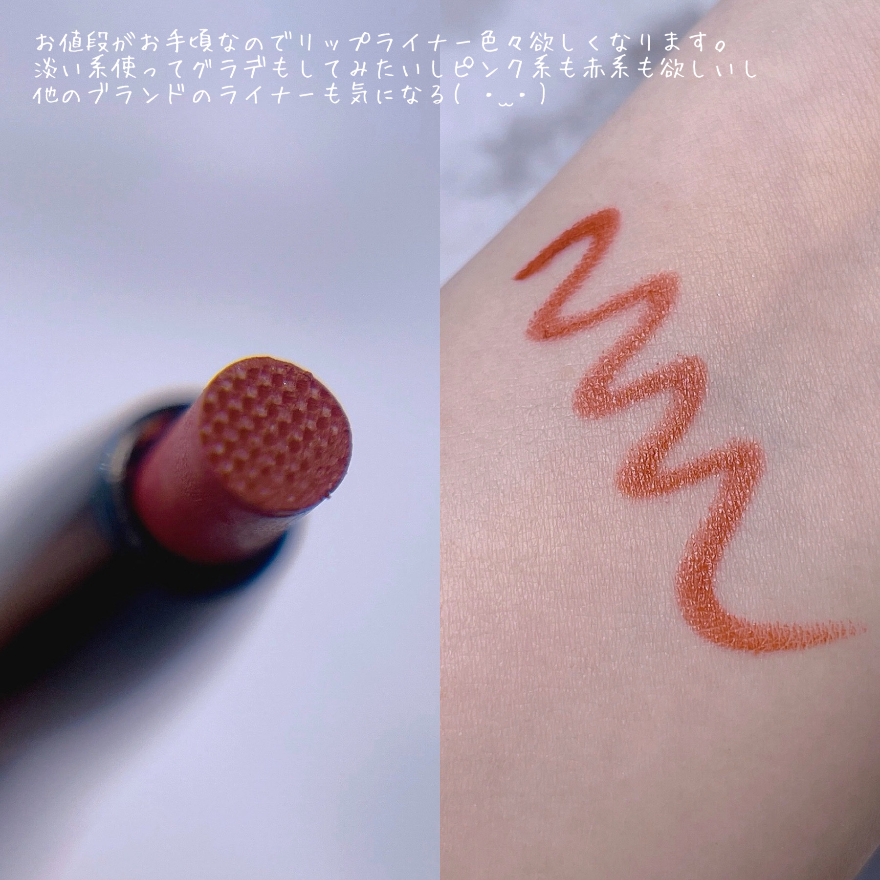 家で見返すとブラウンと言っても何か オレンジっぽい?黄みが強いブラウン かなと思いました。 ブラウンリップと馴染ませると普通に 使えましたけどもう少し暗めの色が 欲しいな〜て感じです。 キスミー フェルム以外にもリップライナー 色々出てるから色んなカラー欲しいです⋈︎