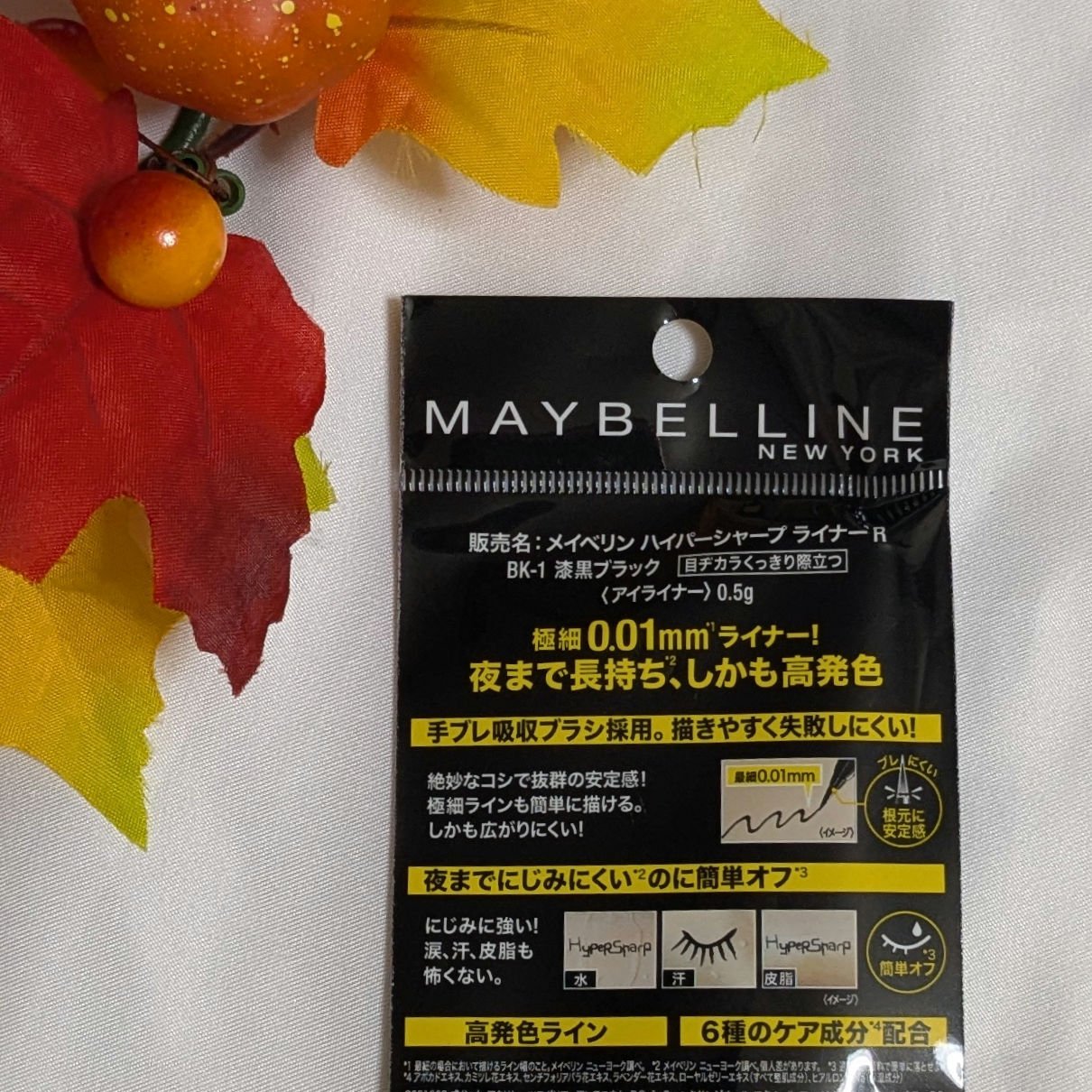 【MAYBELLINENEWYORKハイパーシャープライナーR】カラー:BK-1/漆黒ブラック消えないアイライナーを探してて家族のオススメで購入してみました♪描きやすく、かすれなどなく描けて発色も良いと思います。消えにくさに関してはどうしても...