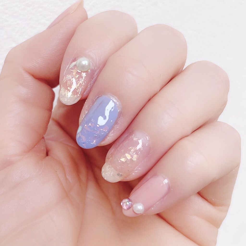 パステルカラーで可愛いスイーツをイメージしたネイルしました🍬 こちらのパラドゥのラメは、数量限定のコフレの中に入っていたものです。淡いラベンダーでオーロラっぽいホロがギッシリ。夢かわな雰囲気になるのでオススメです 🦄💎✨ 塗って貼るだけの簡単なネイルなので良かったらやってみてね(´・ω・`)