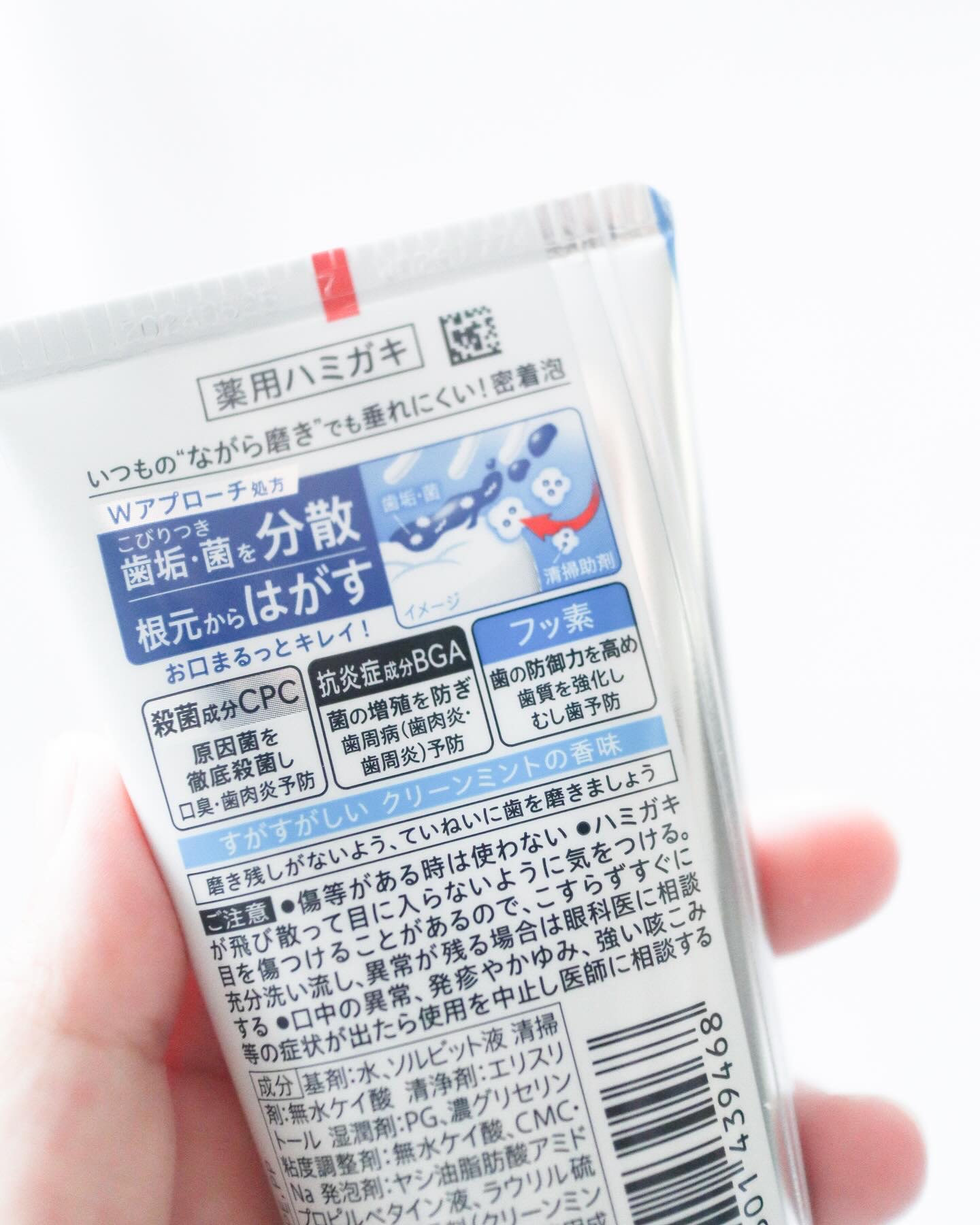 歯垢・菌を根元からはがす!」という特徴の歯磨き粉なんだそう🪥 爽やかな香りのする白くて柔らかいテクスチャーお口に入れても爽やかだけど好みの味でした🌿 普段通りの歯磨きなのに、歯磨き後のなぜかツルツルの舌触りにびっくり🫢