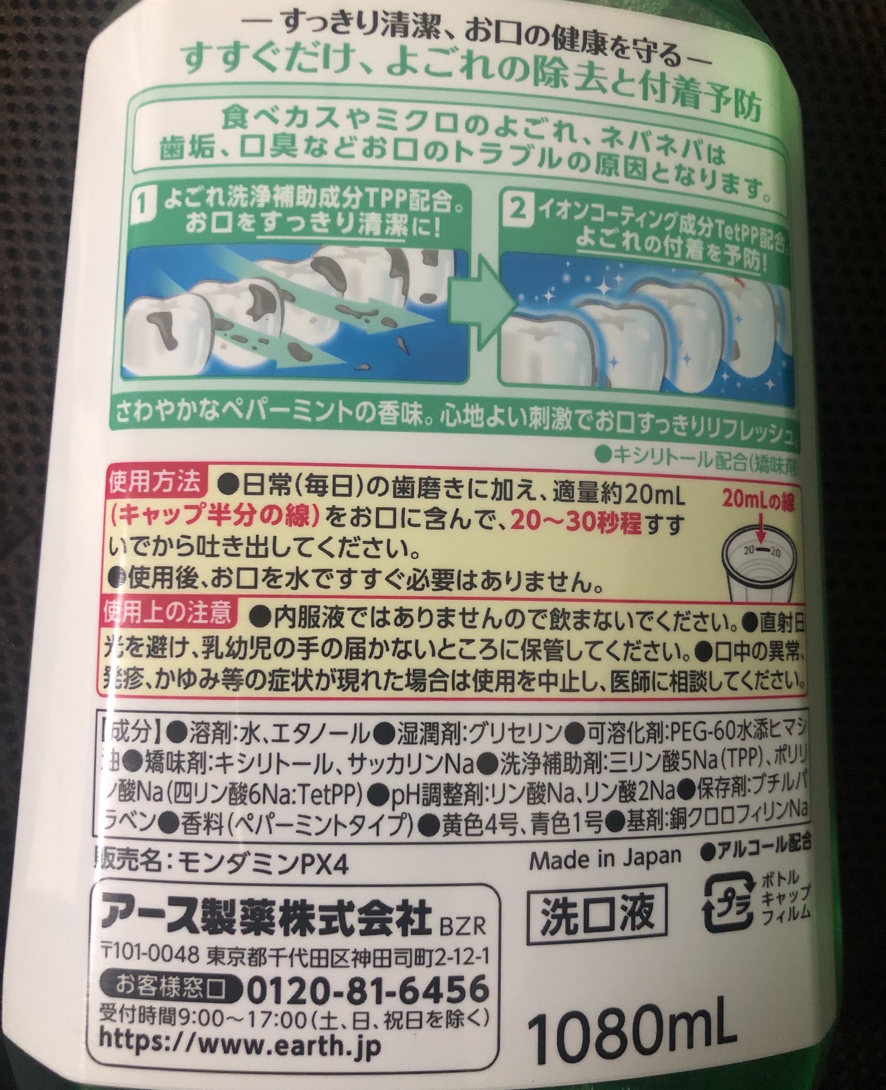 メイクをしない日があっても、歯を磨かない日はないから、息から綺麗を心がけるのも、美容やエチケットだと思うから! ペパーミントは、結構ピリピリするけど、まあまあ我慢できるくらいだと感じます(たまに、我慢できないときは水でもすすいでいます)。 大容量でコスパが嬉しいけど、場所を取るのがネックかな‥