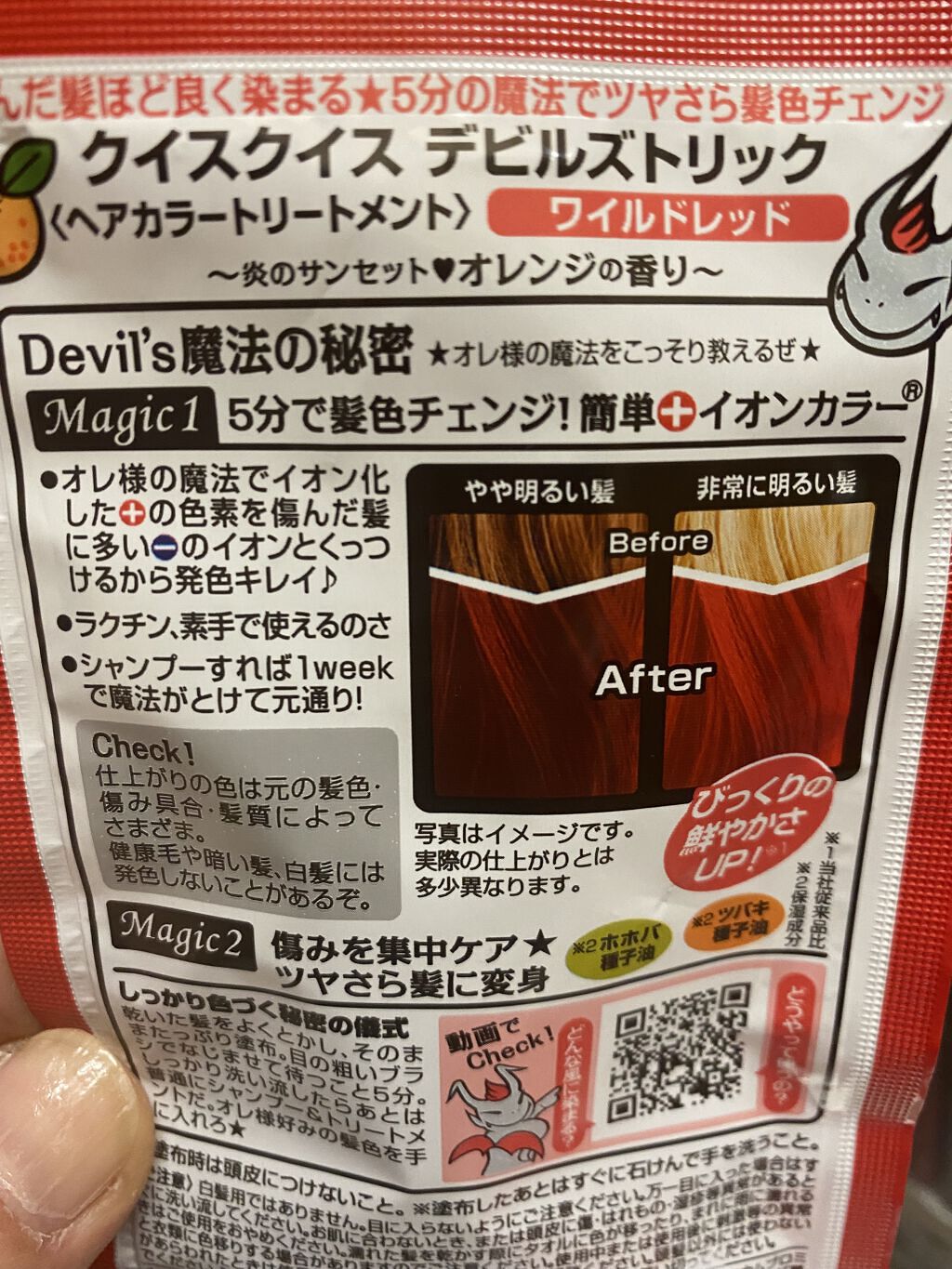 クイスクイスデビルズトリック😈😈😈このデビルシリーズはデザイン変わってるけど昔からあって薬局で安く短期間限定で染められるって学生に人気だった商品😳✨✨元々がブリーチしたりしててハイトーンならすぐ色入るし1、2週間くらいで元に戻るしトリートメン...