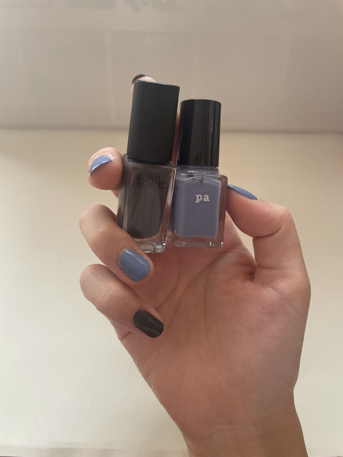 panailcollectiveネイルカラーワンコートフィニッシュF004🟦ネイルホリックGY009⬛️✼••┈┈••✼••┈┈••✼••┈┈••✼••┈┈••✼ブルーとグレーの色の組み合わせがめっちゃかわいくないですか?🟦⬛️最近は二色をランダムっぽく塗ることにハマっていますpaは筆が太めで一気に塗りやすく、ネイルホリックは筆が細めで繊細に塗れます。ちなみに液はpaが圧倒的にサラサラです!ネイルホリックがサラサラじゃないというわけではありませんが!paはかなり水っぽいです。塗りの具合に関しては結構好み分かれるかもです!ただ冬で寒いこともあってこの時期のネイルはひび割れしやすいです🥲誤差ではありますが若干paの方がモチが弱いです。ただ両方とも頑張っても大体5日くらいが限度かなと!ネイルが縮み始めるのは2〜3日目くらいでより早いです。ちなみにトップコートはネイリストを使っていますー!めっちゃおすすめです!速乾でツヤツヤになって最高です!ネイルしてると本当に気分が上がります❄️✨今回は色が特に気に入ってよりテンション上がりました☺️早く次のネイルがやりたいです💅❄️#panailcollective#pa#ネイルカラーワンコートフィニッシュ#ネイルホリック#ネイリスト#クイッククリスタルコートⅡ#ネイルカラー#セルフネイル#マニキュア#あか抜け宣言