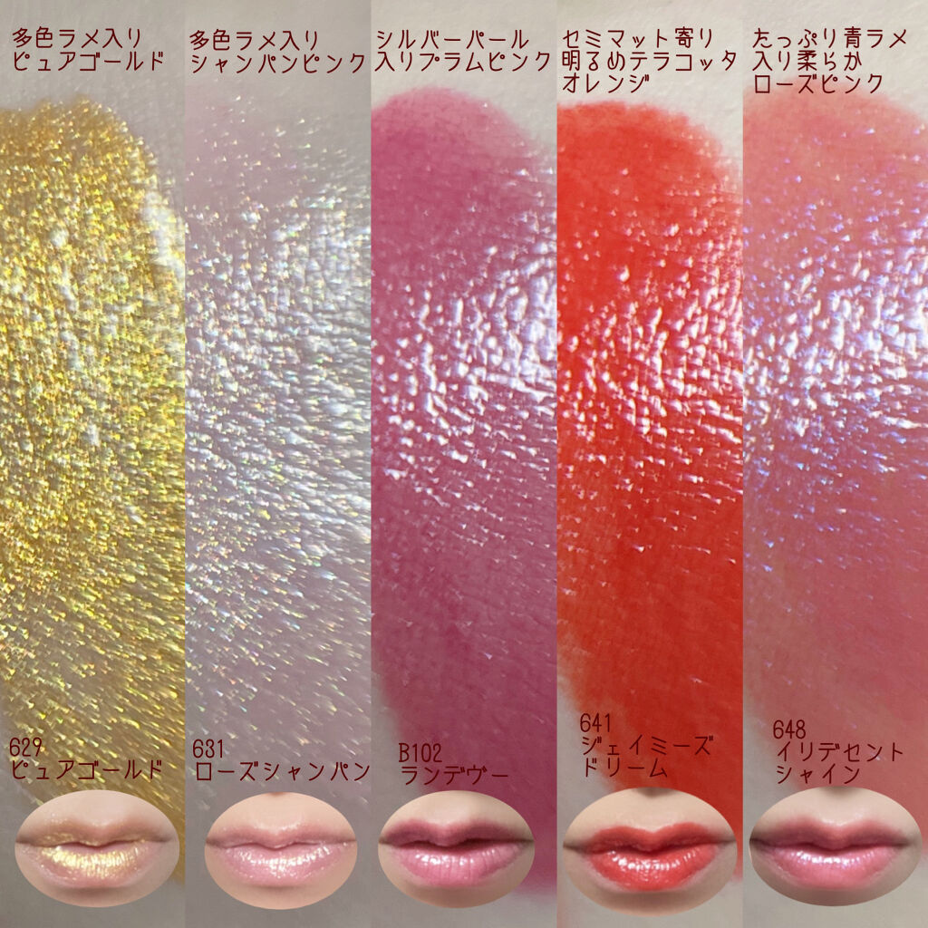 カラーリッシュ ルルージュのまとめ❤︎ 629 ピュアゴールドと 631 ローズシャンパンは多色ラメが ギラギラするド派手リップ⑅︎◡̈︎* B102 ランデヴーは絶妙なプラムピンク のカラーが可愛い❤︎ 641 ジェイミーズ ドリームは リュクスレザーコレクションシリーズの1本。 648イリデセントシャインは ヌードナクレ コレクションシリーズの1本。