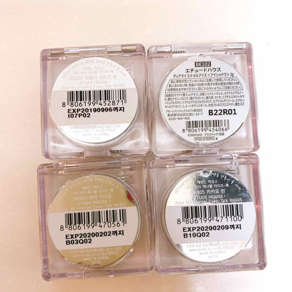エチュードハウスのディアマイエナメルアイトーク写真3枚目右からPK005ベリーシュガーパウダーBE101キャルルキャルルPK001ときめくTokyoの朝BE102両手いっぱいの流れ星です!写真3枚目は、少し濃いめに4枚目は少し薄めにして腕にの...