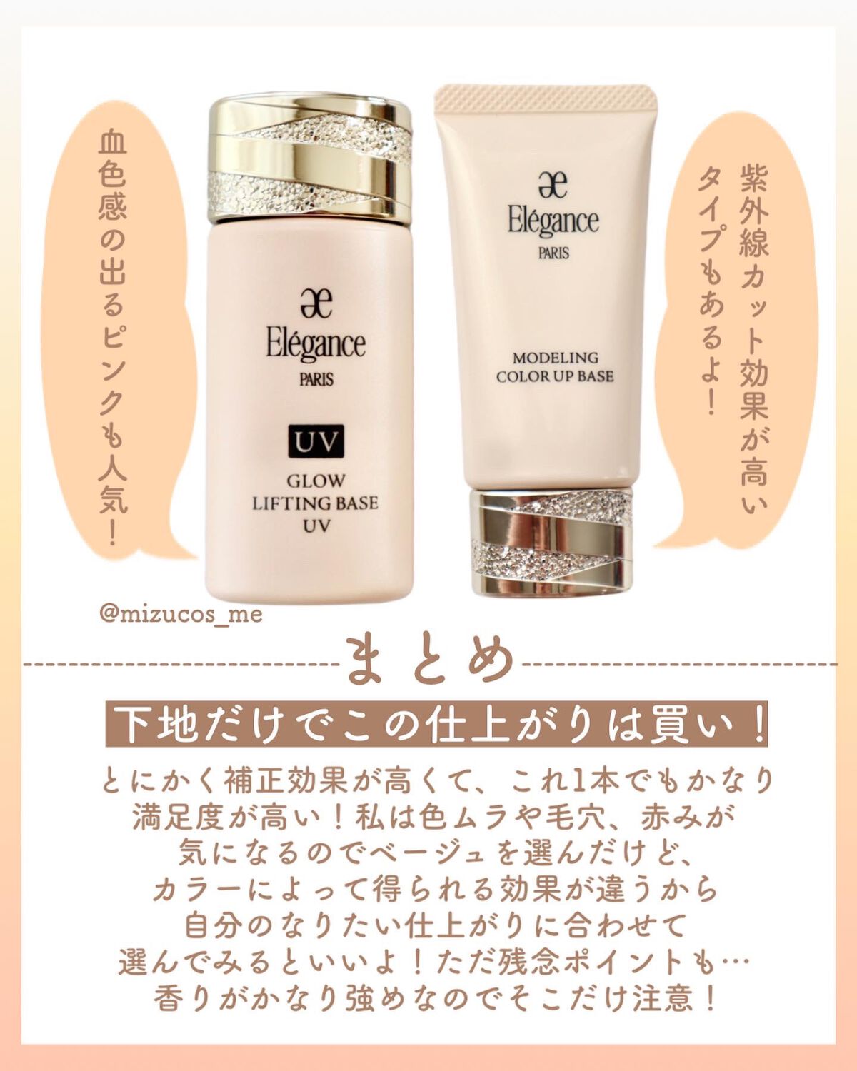 美肌は詐欺れる!!========================elegance(@elegance_cosmetics)・グロウリフティングベースUVSPF40/PA+++BE991 →5,500円(税込)・モデリングカラーアップベースSPF25/PA++BE902 →4,950円(税込)========================美肌見えするのに欠かせない愛用下地を紹介するよー!#モデリングカラーアップベースは昔からある名品だよね!いろんなベスコスも受賞していて効果はお墨付き!なんと言っても色展開がたくさんあって悩みに合わせて選べるのがポイント👍#グロウリフティングベースuvはその名の通り、肌を引き上げるようにサポートしてくれてハリ感ある印象に!こちらは2色展開だけど、UVカット効果が高いから夏でも使いやすい!ただ白くトーンアップするものと違って自分の悩みや、なりたい仕上がりに合わせて色の効果を味方につけることが美肌見えへの近道だと思ってる!私はどちらもベージュ系の色を使ってるんだけど補正効果がしっかりあるからこれだけでもかなり綺麗に見えるの!これ1本でも毛穴や色ムラが目立ちにくくなって鼻もつるんと見えるよ!グロウリフティングベースUVは割とサラッとした仕上がりなので#マスクメイクとも相性がいいと思う🙆♀️最近は、日焼け止めをしっかり塗ってグロウリフティングベースUVを顔の中心をメインに塗る!ファンデなしで仕上げると崩れもないし美肌にも見えてお気に入り😘もちろん上からファンデを重ねてもOK!少量で済むし、バッチリメイクにも対応👌ただ一つ…気になることもあるそれは香りが強いこと!!!これ結構惜しいポイントなのよね🥲いい香りではあるんだけどこれつけた後すぐマスクとかしちゃうとずっと匂ってくる感じ🤣笑苦手な匂いではないけど香水を至近距離で嗅いでる感じなので匂いに敏感な方はちょっとオススメできないかも🥺仕上がりとか使い心地は本当に好きなので自分に合う色で試してみてね💓#elegance#エレガンス#化粧下地#デパコス#ベースメイク#イエベ#イエベ秋#ウォームオータム#ウォームスプリング#コスメ垢#コスメ購入品#夏コスメの戦利品#さよならコンプレックス#ノーファンデ宣言#天然美少女メイク