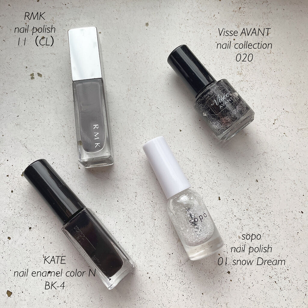 【クールな手元が簡単で可愛いんです🖤】〈item〉#ケイト ネイルエナメルカラーNBK-4 ¥396(税込) 王道ブラックネイル🖤 発色も塗りやすさも最高なんです💅🏻 アレンジしてもお洒落で存在感も抜群です💫#sopoネイルポリッシュ01SnowDream ¥550(税込) 透明な液にホワイトのホロやオーロラ系のラメが光る重ねるとより存在感が出るラメネイル💅🏻 ブラックとホワイトの相性が抜群で可愛いんです😍 ベースのカラーを変えるだけでも雰囲気が変わる✨ #RMKネイルポリッシュ 11(CL)ハッシュトバイオレット ¥1650(税込) シアーな仕上がりのグレーネイル💅🏻 派手すぎず大人っぽくクールな手元に仕上がります✨ グレージュっぽいクリアなカラーが抜け感が出てお洒落⭐️#ヴィセアヴァン ネイルコレクション020 愛用したラメネイル✨ パールがお洒落で細かい銀河の様な発色に💫 ワンポイントでも華やかな仕上がりに🖤----------〈Howtouse〉①ベースコートを塗ります。 お好きなベースコートを塗り、乾かします。②親指、人差し指、薬指にケイトの#BK-4を2度塗りします。 しっかり乾かします。③中指にRMKの#11を2度塗りします。 乾いてから、チェックのネイルシールを貼ります。④小指にヴィセアヴァンの#020を2度塗りします。 しっかり乾かします。⑤人差し指にsopoの#SnowDreamを1度塗りで重ねます。 ベースが乾いた後サラッと重ねます。⑥トップコートを塗って完成です。 しっかり乾かしてから、お好きなトップコートを塗って完成です。----------トップコートは2度塗りするとツヤっと仕上がって綺麗に🖤クールな手元が可愛くてお気に入り💅🏻お気に入りカラーでネイルしました✔️最後までご覧頂きありがとうございました😊----------#ネイル#ネイルカラー#ネイルポリッシュ#ネイル写真#ネイル記録#マニキュア#セルフネイル#プチプラネイル#プチプラ#コスメ好きさんと繋がりたい#コスメレビュー#メイク好きな人と繋がりたい#コスメレポ#プチプラコスメ#KATE#ネイルエナメルカラーN#BK-4#sopo#ネイルポリッシュ#01:スノードリーム#RMK#11#CL#ハッシュトバイオレット#Visée#ヴィセアヴァンネイルコレクション#020#STARDOM#ガチレビュー