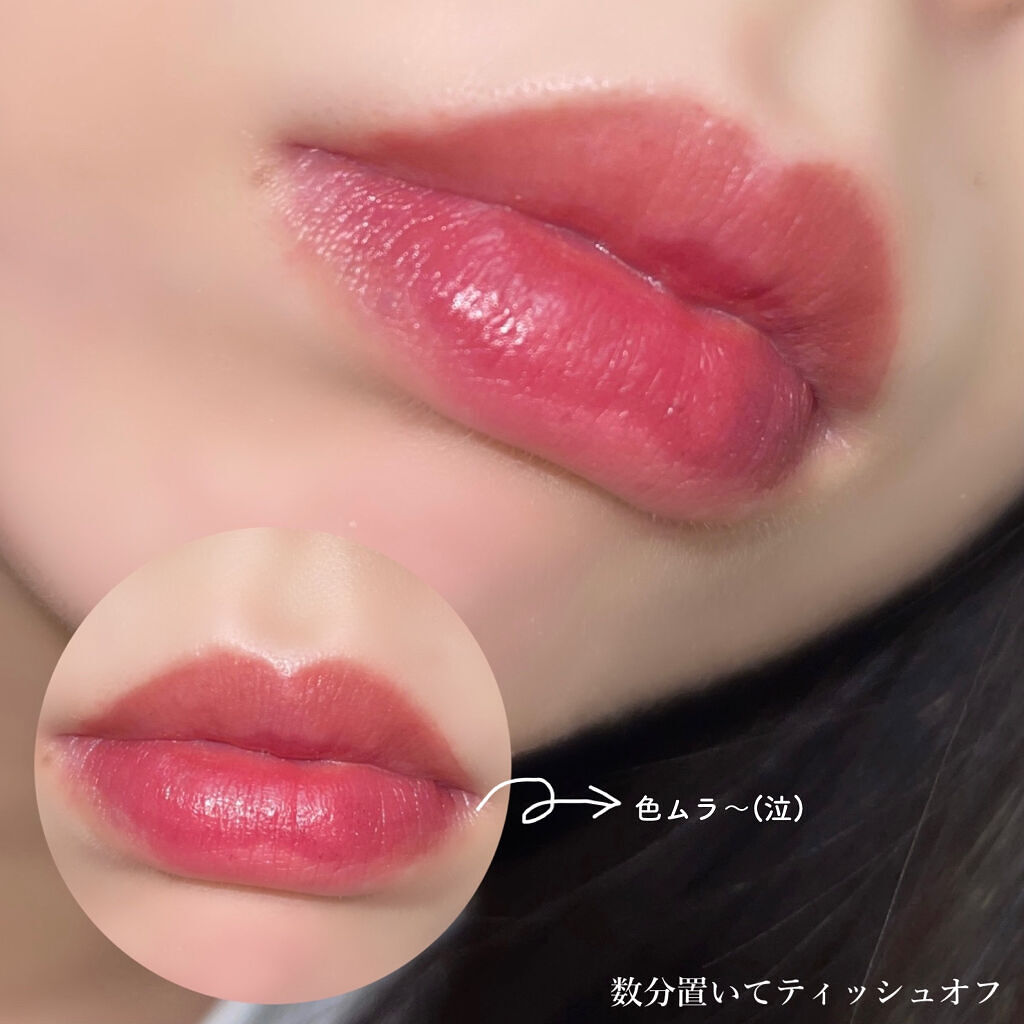 使えていない一番の理由は、'色ムラが激しいこと'です。 わたしの場合、唇の中央あたりが濃くなり外側が薄く発色してしまうので、色ムラが激しく出てしまいます。 色味や質感・つけ心地は好みなのに、仕上がりが汚すぎて使えておりません…😭 ただ、わたしの唇には合わなかったってだけなので、リップ自体は定着力も凄いし、全然落ちなくてつけ心地も軽いので優秀だと思います☺️