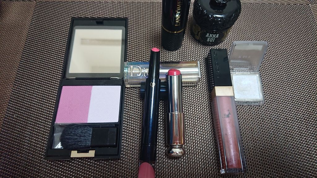 目…SUQQUのグロウタッチアイズ05曙染を目尻側から中央に向かってぼかして広げていき、その後にラメ足しにRMKのグロージェルの02ブルーをSUQQUに重ねるように塗る。写真3枚目左SUQQU、右RMKです。口…クレドポーボーテのルージュルミヌ06番を全体に塗り、少しだけ内側にDiorアディクトリップ587番を重ねて塗る。ルージュルミヌもアディクトリップも全然乾燥しなくて唇荒れたりもないです。写真2枚目は左Dior、右クレドです。肌…チークとハイライトにSUQQUピュアカラーブラッシュ110萩花。とても薄づきなので濃くなりすぎることがなくて使いやすいです。
