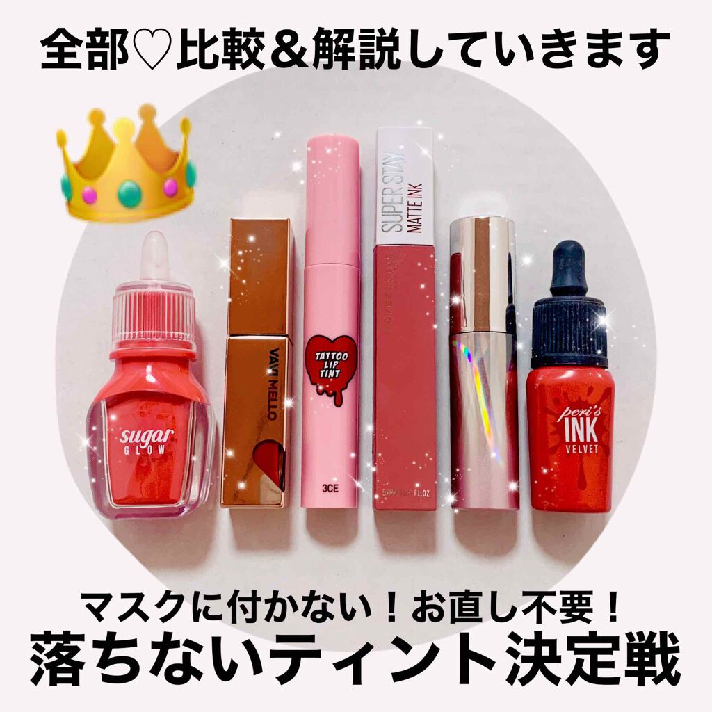 💋落ちないリップ選手権💋お直し不要♡マスクにも付かない!落ちにくいプチプラティントリップまとめてみました🌸今回は分かりやすいように赤系でまとめました☺️❤️下の方に1位〜3位があります🎉ーーーーーーーーーーーーーーー💋シュガーグロウティント💋(PERIPERA)¥600〜¥800ーーーーーーーーーーーーーーーツヤタイプカラー:#01ストロベリースウィート落ちない度★★★☆☆乾燥しない★★★★☆残り方★★★★☆発色★★★☆☆元々が結構ナチュラルな発色なのでティントだけど、がっつり色が出ない👌かなり軽めのテクスチャ☁️これ一本塗りでも乾燥しにくいです◎でも腕などに塗ると綺麗に発色して色も残るので、唇の色が元々薄い方にはすごく馴染んで使いやすいです(˘ω˘)✨ーーーーーーーーーーーーーーー💋タトゥーリップティント💋(3CE)¥1,500ーーーーーーーーーーーーーーーマットタイプカラー:#1LUZTIC落ちない度★★★★★乾燥しない★★★☆☆残り方★★☆☆☆発色★★★★★「絶対に落ちない!」と噂のリップ💄本当に落ちにくい!だけど塗るときにミスって唇の外とかに付いたりなんかしたら、もう取れない(笑)発色もパキッとしてて良いけど、時間が経つと唇の縦ジワだけに濃い色が入り込んで結構汚く残っちゃう…飲んだり食べたりしなければ綺麗なまま落ちずに残るんだけど😢ーーーーーーーーーーーーーーーー💋ウォーターライトティント💋(A'pieu)¥789ーーーーーーーーーーーーーーーーツヤタイプカラー:RD06もみじのプライド落ちない度★★★☆☆乾燥しない★★★★☆残り方★★★☆☆発色★★★★☆乾燥しないし個人的には大好き💖オイルっぽいけど軽いテクスチャでツヤツヤ&うるうるの唇になる💋だけど落ちにくさでいうと、すごく残るわけではないので他のティントの上に重ねてグロス代わりにすると良い🌸元のティントが落ちにくくなるよ🙆♀️🥉第3位🥉ーーーーーーーーーーーーーーーーー💋スーパーステイマットインク💋(MAYBELLINENEWYORK)¥1,500ーーーーーーーーーーーーーーーーーマットタイプカラー:130落ちない度★★★★★乾燥しない★★☆☆☆残り方★★★☆☆発色★★★★★これも落ちないリップで話題に💋本当に落ちない!発色がすごく良い!良い意味でペンキみたいに色がしっかりつく✌️色展開が青みピンクからオレンジやブラウンまで色々揃ってて魅力的♡♡しかし落ちない度で言うと、一位と争うレベルで色が残ってくれるんだけど…ただ、乾燥が気になる!!😢グロスなどの保湿系リップ必須❣️🥈第2位🥈ーーーーーーーーーーーーーーーーーーーーー💋ハートウィンドウリップティントオイル💋(VAVIMELLO)¥1,400ーーーーーーーーーーーーーーーーーーーーーツヤタイプカラー:03ブロッサムオイル落ちない度★★★★☆乾燥しない★★★★☆残り方★★★★★発色★★★★☆強すぎず薄すぎず、上品な発色🥀スルスル塗れるし、縦ジワも隠せる💖オイルだけど、こっくり&サラサラ(?)した不思議なテクスチャなので時間が経っても乾燥しにくいです☺️パッケージもハートの小窓から色が分かるようになってて可愛い❤️がっつり残るタイプのティントではないのですが仕上がりや総合評価的に2位です🌈🥇第1位🥇ーーーーーーーーーーーーーーーー💋ペリペラインクベルベット💋(PERIPERA)¥1,200ーーーーーーーーーーーーーーーーマットタイプカラー:02落ちない度★★★★★乾燥しない★★★★☆残り方★★★★☆発色★★★★★私が愛してやまないティント🐰💕落ちなさ・仕上がり・コスパこれ以外考えられません🌸唇にしっかり色が付いてくれるんだけど汚い落ち方はしない!というか落ちないから分からないくらい❣️グラデーションにもしやすいです〜🌈一回塗ってちゃんと乾かしてオフしたらティッシュにも付かないので、マスクの下用のリップにも良いです👌個人的には、今回紹介したものは唇が荒れたりしませんでした(˘ω˘)ぜひ今後のリップ購入の参考になれば嬉しいです🌈*.ちなみに!さらに落ちにくくするには、リップを塗る前に軽くパウダーを唇に仕込んでおく!薄く均一に塗ると綺麗に仕上がるよ!特に、イニスフリーのパウダーおすすめ🙌