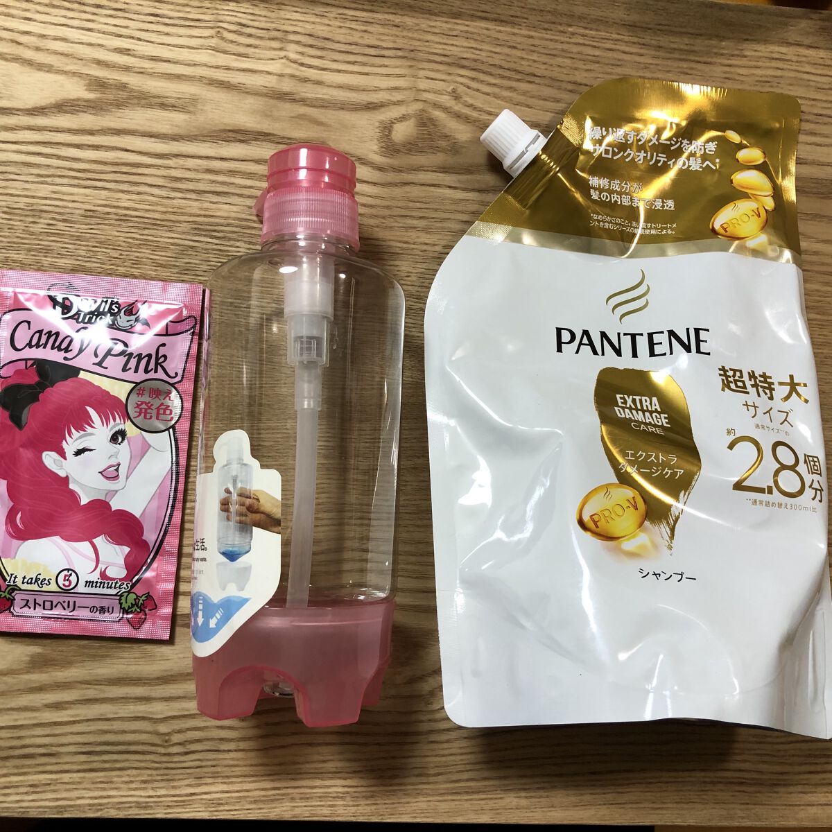カラーシャンプー使ってみたいけど、ちょっと高い…。そんな時は、自分でカラーシャンプー作ってみるのはどうですか??【材料】・デビルズトリック・市販のシャンプー・ボトル【作り方】①材料を用意する②ボトルにデビルズトリックとシャンプーを入れる③混ぜたら完成!⚠︎かなりピンク感を出したい方には、シャンプーで薄めてしまっているので物足りなくなってしまうかもしれません。なので、色の濃さはシャンプーの量で調整してください!【感想】バイト先が髪色厳しくて、Theピンク!!ってなってしまうと怒られてしまうので市販のカラーシャンプー怖いな…って思っていました。しかし、1週間で落ちるデビルズトリックを、シャンプーで薄めることで若干ピンク?かなくらいにできるのでほんのりピンクの人におすすめだと思いました!家にシャンプーとボトルがあれば、デビルズトリックの270円でできてしまうのでコスパバッチリです!!染めたことない髪は、染まりにくいと思います🙇♀️また、真似する際は自己責任でお願いいたします🙇♀️#デビルズトリック#キャンディピンク#daiso#残さず使えるポンプボトル#パンテーン#エクストラダメージケアシャンプー#神コスパアイテム#はじめての投稿#カラーシャンプー