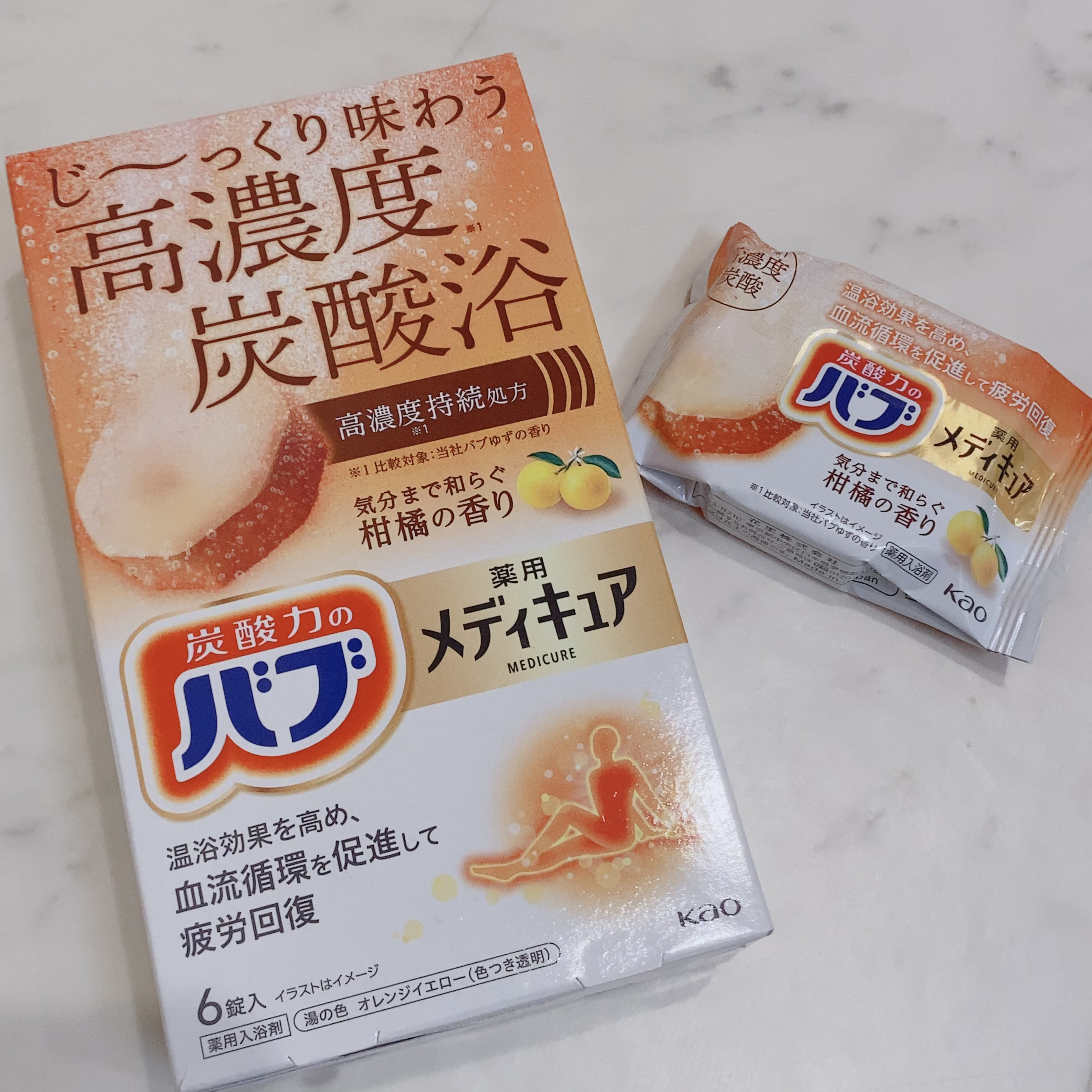 バブ メディキュア 柑橘の香りは、温浴効果を高めて血流循環を促進し疲労回復をしてくれる医薬部外品の入浴剤です🥰 1袋(1個)を湯船に入れると、しゅわしゅわと発泡してほんのり黄色に💡´- 体もぽかぽかと温まるし、1日の疲れをこの入浴剤入りのお風呂で労わっていきたい…🛁🫧