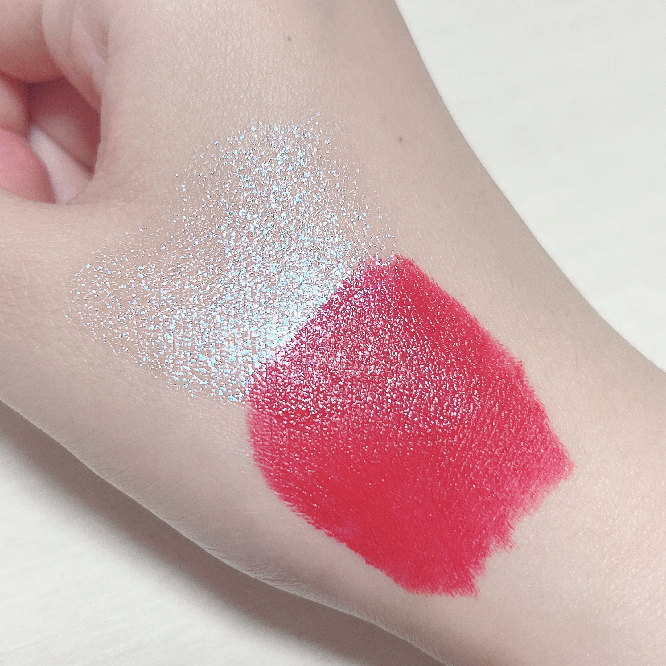 パケ大好きだったからずっと取っといてた 当時私の選んだセンスが悪いせいで『Theブルベ冬のマット赤』に『唇が水色に光るラメ』を組み合わせてしまった もちろん自称イエベ春の私には似合わず手が伸びなかった😂 手に塗る分にはめちゃくちゃ好きദ്ദി^._.^)