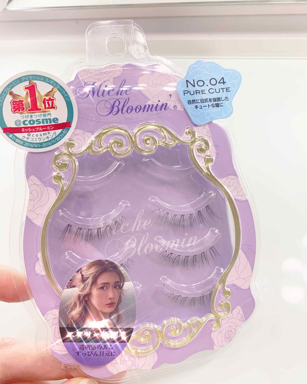 ミッシュブルーミンのNO.04 ピュアキュートを使用しました♡パッケージから既に可愛い♪こちらのピュアキュートは「自然に目尻を強調したキュートな瞳に」がコンセプトだそうです。つけまつげ単体で見ると結構毛が長めなのでケバくならないかな…と少し不安でしたが、実際につけてみるとめちゃくちゃ自然でした(*´ω`*)こちらのミッシュブルーミンのつけまつげは、【エアリー極細毛】が特徴で毛先がとっても細くなっています。つけまつげを付けると目が重い、違和感があって苦手…という方も多いと思いますがこちらはとっても軽いので違和感なく使えました♪一般的なつけまより20%も軽量化されているそうです!そしてこのミッシュブルーミンは種類の豊富さも特徴的で、No.1~28まであります。その日のメイクやなりたい目元に合わせてデザインを選べます☆沢山デザインがあるので、ミニグルー付きの1ペアでお試しするもよし、お気に入りのデザインを見つけたらたっぷり使える4ペア分買うもよし!その日の気分によってメイクの雰囲気も変えられるのでおすすめです♡