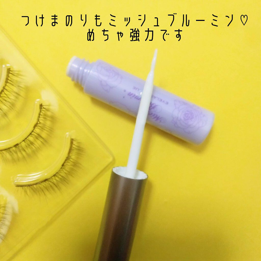 めっちゃナチュラルで色はブラウン交じりだから 付けてます!感が全くない😍 自然に盛れる✧ ミッシュブルーミンのつけまは エアリー極細毛なのが特徴✧ 高品質な毛質はこれのおかげ♡♡ アイラッシュグルーは超強力接着!! 24時間高密着のウォータープルーフ✧ 塗りやすい筆だし、透明になるのも早いから 使いやすい!!!😊 あくびたくさんしても取れなかった🥺✧