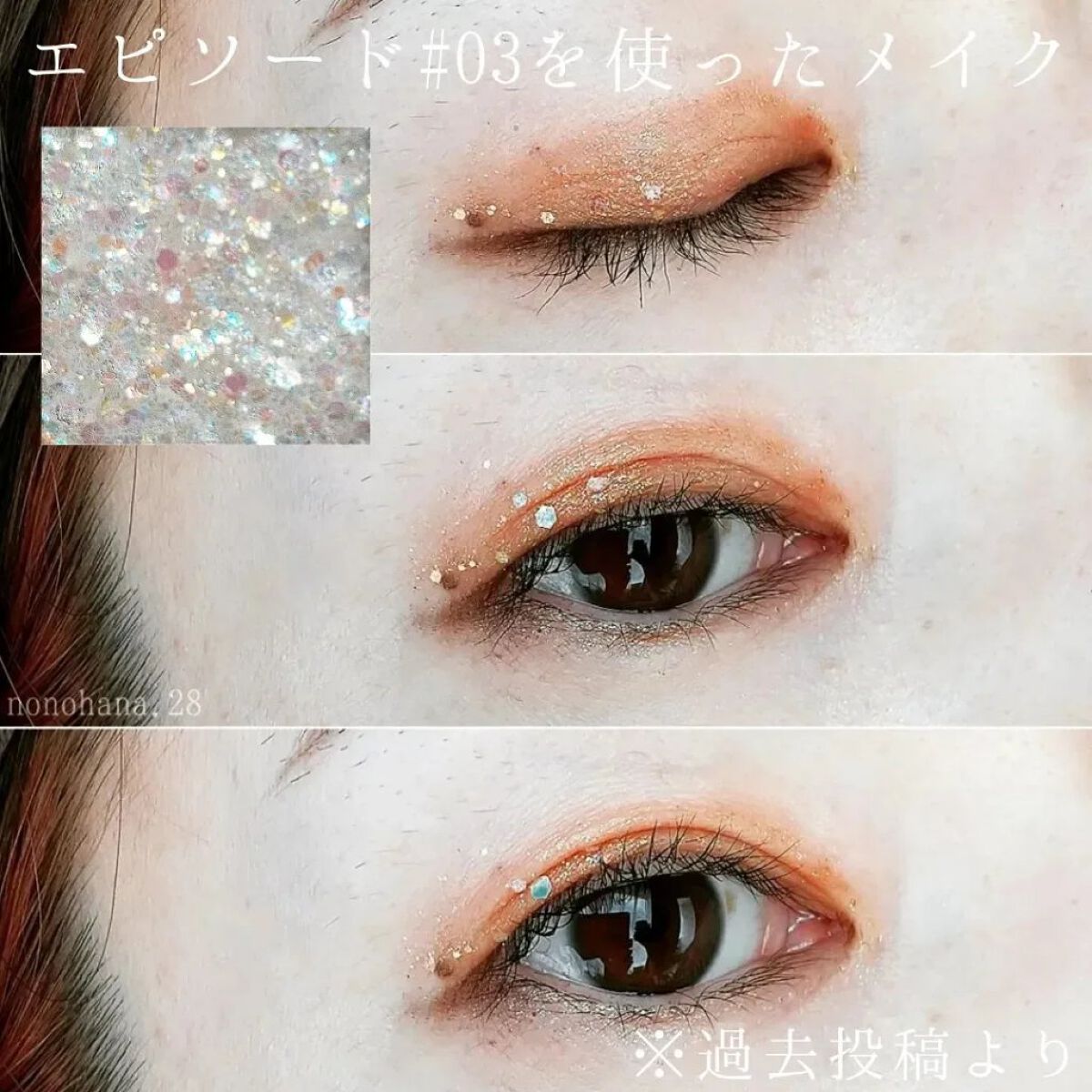 CELEFITのエピソード3の左上を使います。 多色で大小様々なラメが人魚の鱗のようで綺麗🧜♀✨ ミシャのデューイグロッシーアイズホワイトを使用。 繊細なラメも綺麗で角度や日の当たり方で煌めきが異なるのも魅力的ですごく美しい!! かなりしっとりしていて指塗り推奨👆 華やかさをプラスしたいときにぜひ使ってほしいアイテムです😊