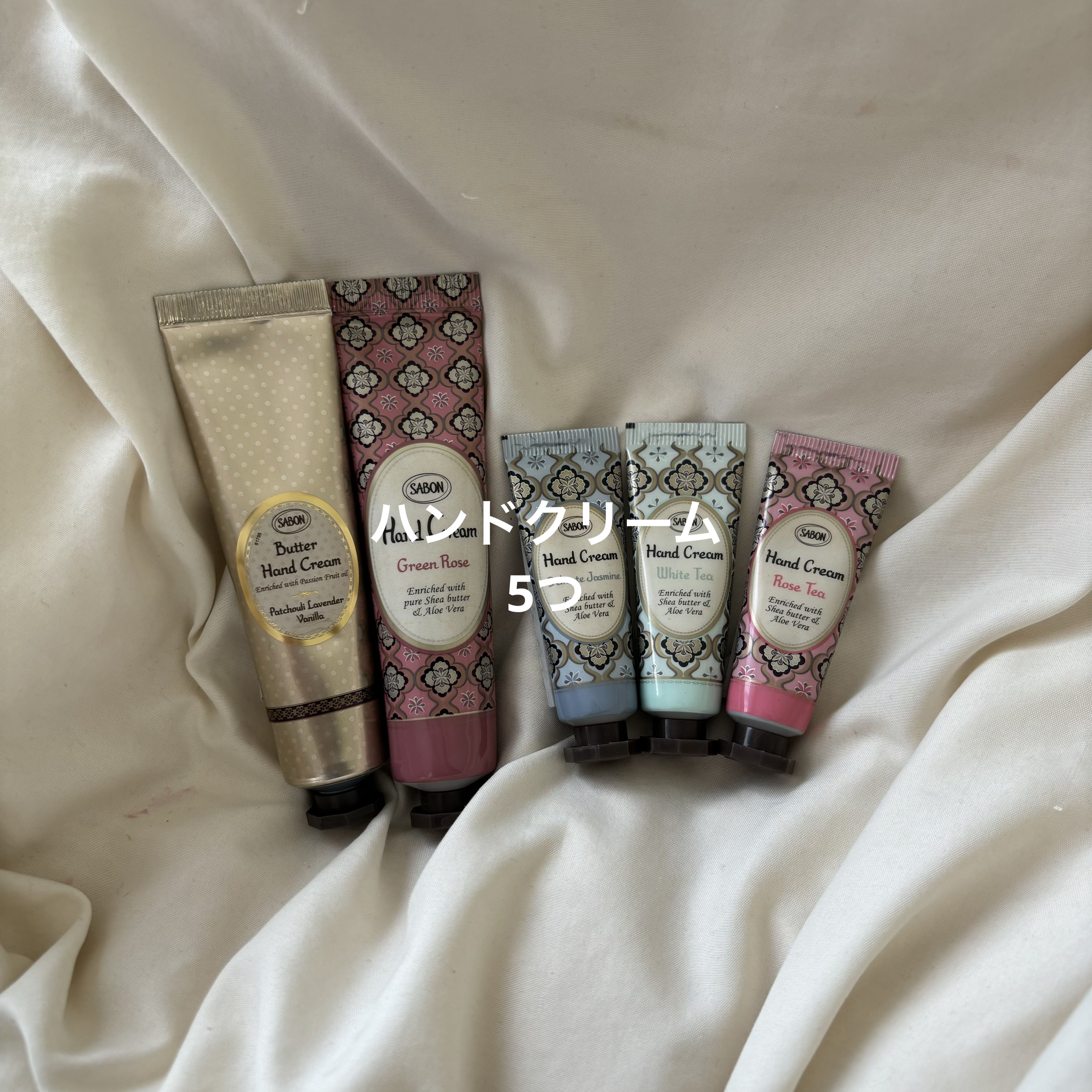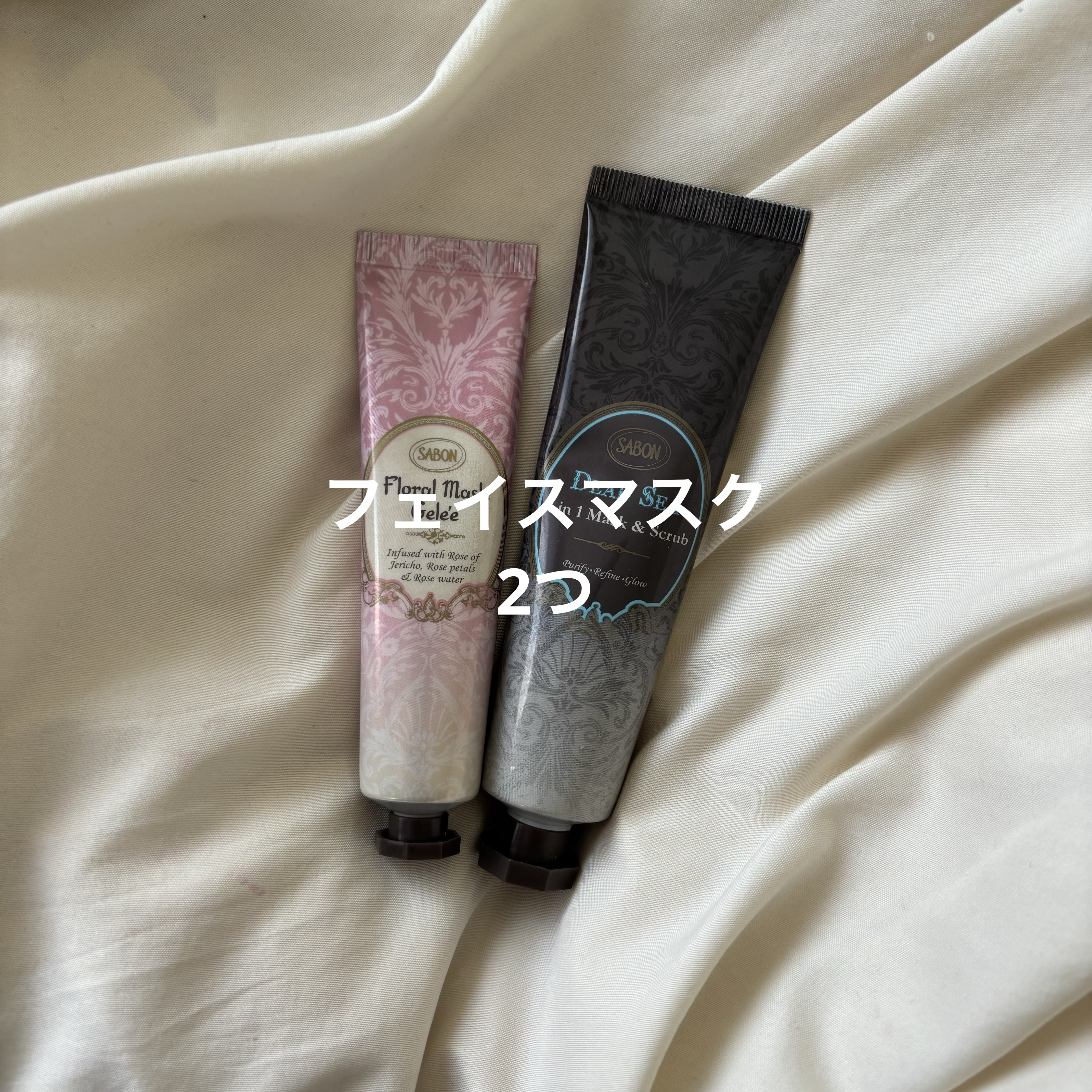 これは1.2を争うレベルで嬉しかったもの!!! 元々バターハンドクリームの質感が大好きだったんですが、普段75mlの販売しかなく、持ち歩くには不便な大きさだったのでずっと購入していなかったんです。 24個の中で1番予想していなくて、びっくりしたもの 普段サボンのヘッドスクラブを愛用していて、ずっと手で使用していたので、使えて可愛いツールが入っていてとても嬉しかったです! 私がサボンの中で1番好きな香りのローズティー+現品サイズを普段使っているハンドクリームの超ミニサイズ🎀 私は初めて知った商品の洗い流すマスク! 10分置いて洗い流して使用するタイプで、使った後は 乾燥を防ぎつつ、本当に肌をツルツルにしてくれて 本品が欲しくなりました!!
