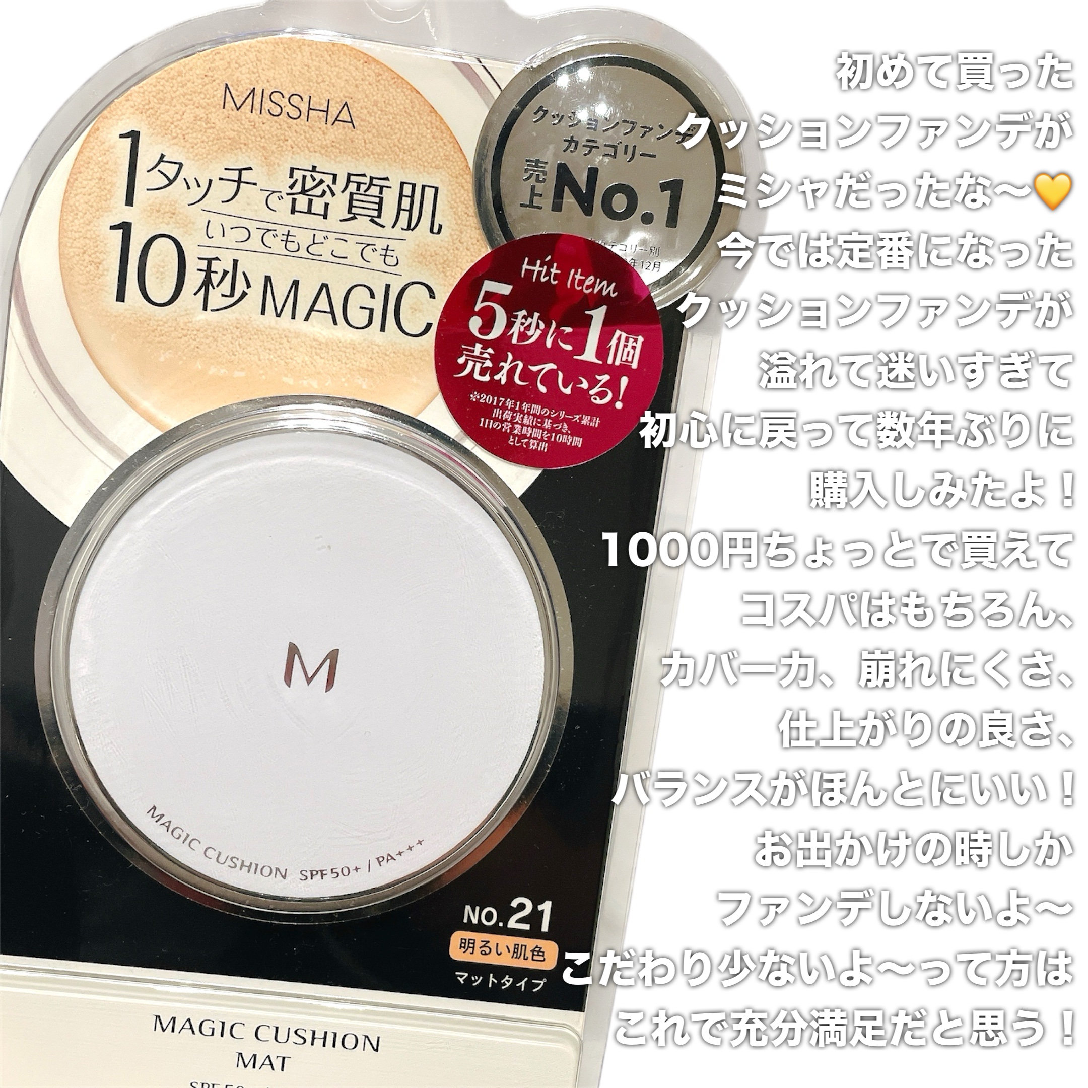#ミシャ#MISSHA#クッションファンデ#クッションファンデーション#マット#No.21¥1,000★★★★☆4/5安い!コスパ良い!隠れる!一瞬でマットなツヤ肌!ただ一点だけ。自分がオイリー肌だからか、時間が経つとよれてきてしまう...こ...