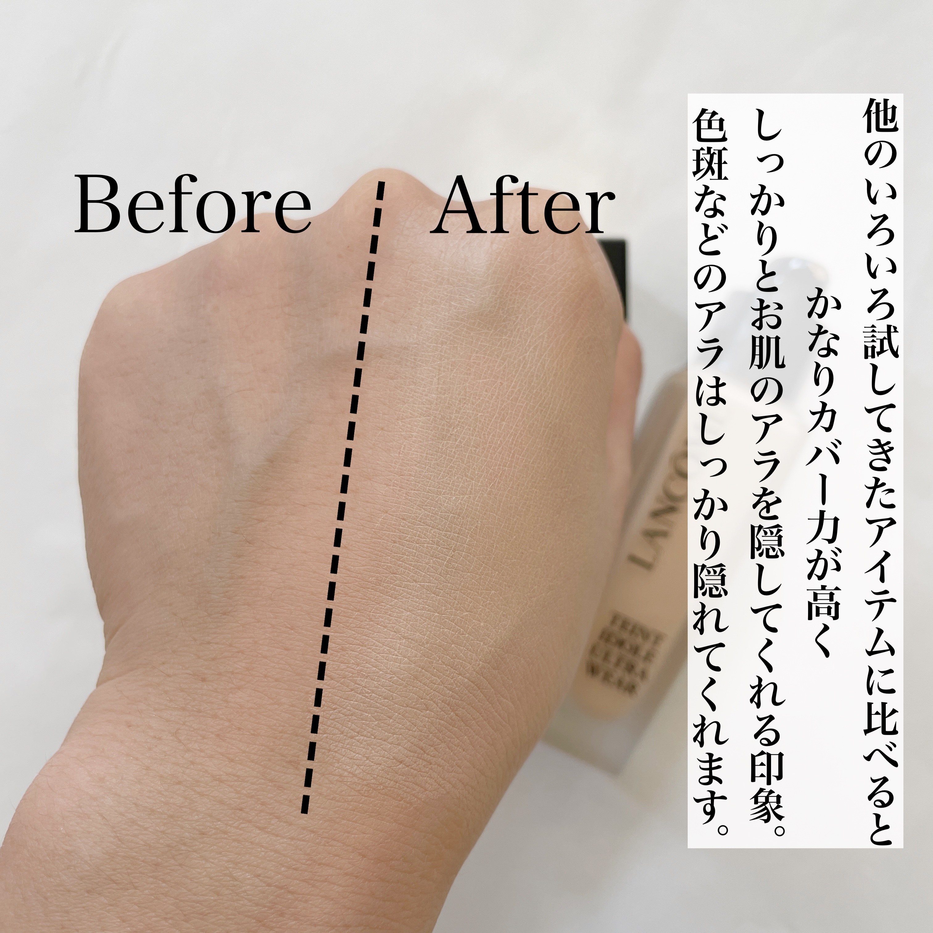 まずピンクベースの明るいカラーのサンプルを用意してあるってすごいですよね👀 ファンデを手の上に広げた感じだと色は結構濃く見えました。 ただ顔の上に塗り広げるとすーっと伸びて肌に馴染んでくれた✨ カバー力は普通だったかな〜 たださすがデパコスなところは、崩れ方が綺麗なことです🤩 ただパウダーつけた方がより崩れにくいので、パウダーつけることをお勧めします! わたしは鼻の部分だけ結構よれたかな?ただお直しでカバーできる範囲内◎