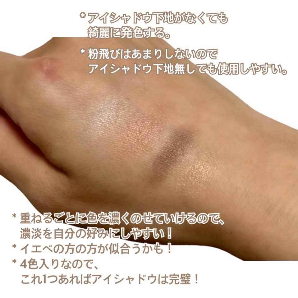 特にベージュがお気に入りです! 重ねるほどに美しく輝いて 他のアイシャドウとの相性も◎ しっとりした質感なので 粉飛びもせずに夜まで綺麗をキープしてくれます✨ スクワランが配合されているので 目元の乾燥が気になる方にもおすすめです🤍