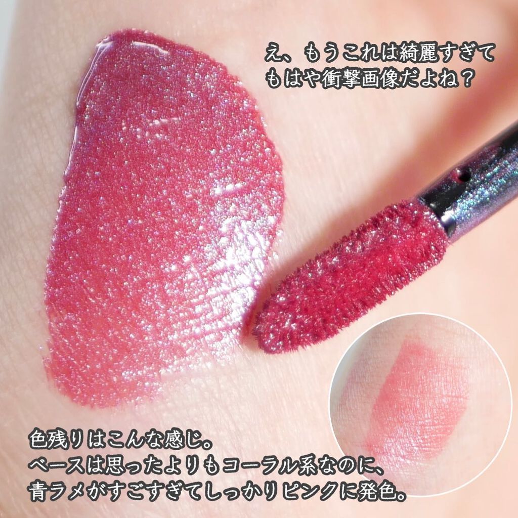 これは即お気に入り上位に入ります、青ラメやーばい。 ギラギラの青ラメではなくて、細かいパールの青ラメがぎっしり。 色は、ベースが少しコーラルよりのピンクで、青ラメのおかげで唇の上では青みピンクに!