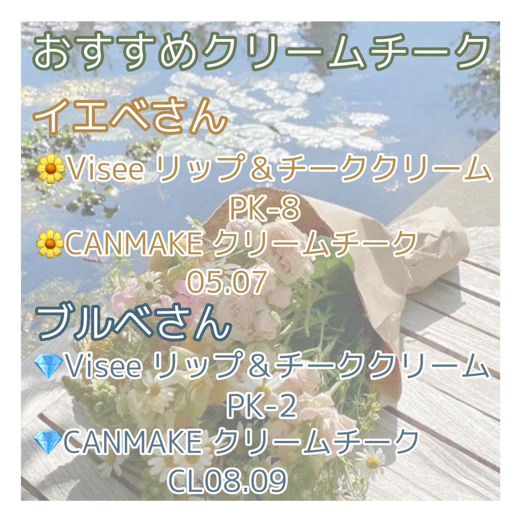 〝Visée/リップ&チーククリームN〟パウダータイプのチークとは違い、じゅわっと滲みでるような色づき方が綺麗です⑅◡̈*程よいツヤ感もあり、乾燥肌の私にはあっているような気がします。指でとると、体温でとけてなめらかなテクスチャーになります。...