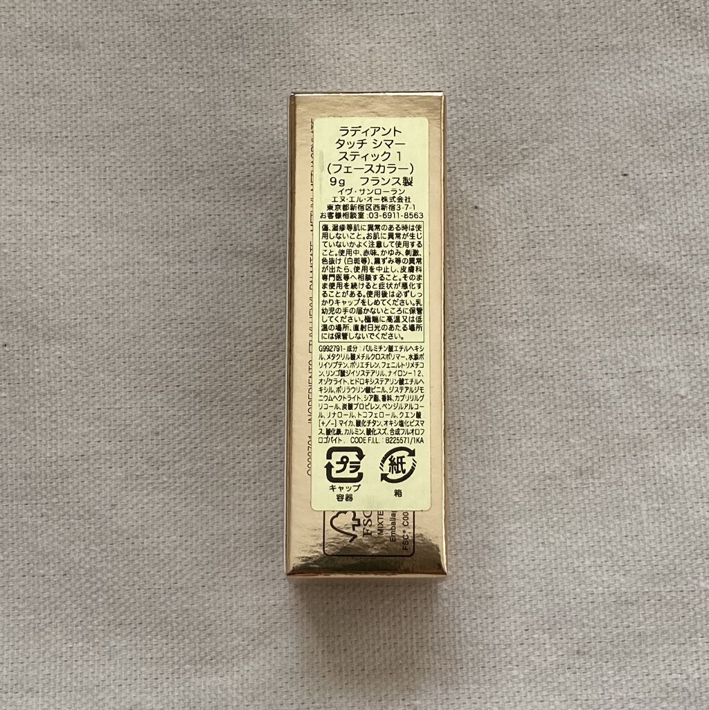 YVESSAINTLAURENTBEAUTEラディアントタッチシマースティック1ライトゴールドゴールドのパッケージが高級感ある、イヴサンローランのスティックタイプのハイライトです。Yの刻印があり、表面から使うのが少し勿体ないです…スティックタイプのハイライトはぺたぺたするイメージがあったのですがこれは肌に乗せた途端サラサラした質感になり、ぺたぺたしません。ギラギラ強すぎず、少量でも自然なツヤが作れます。#あか抜け名品