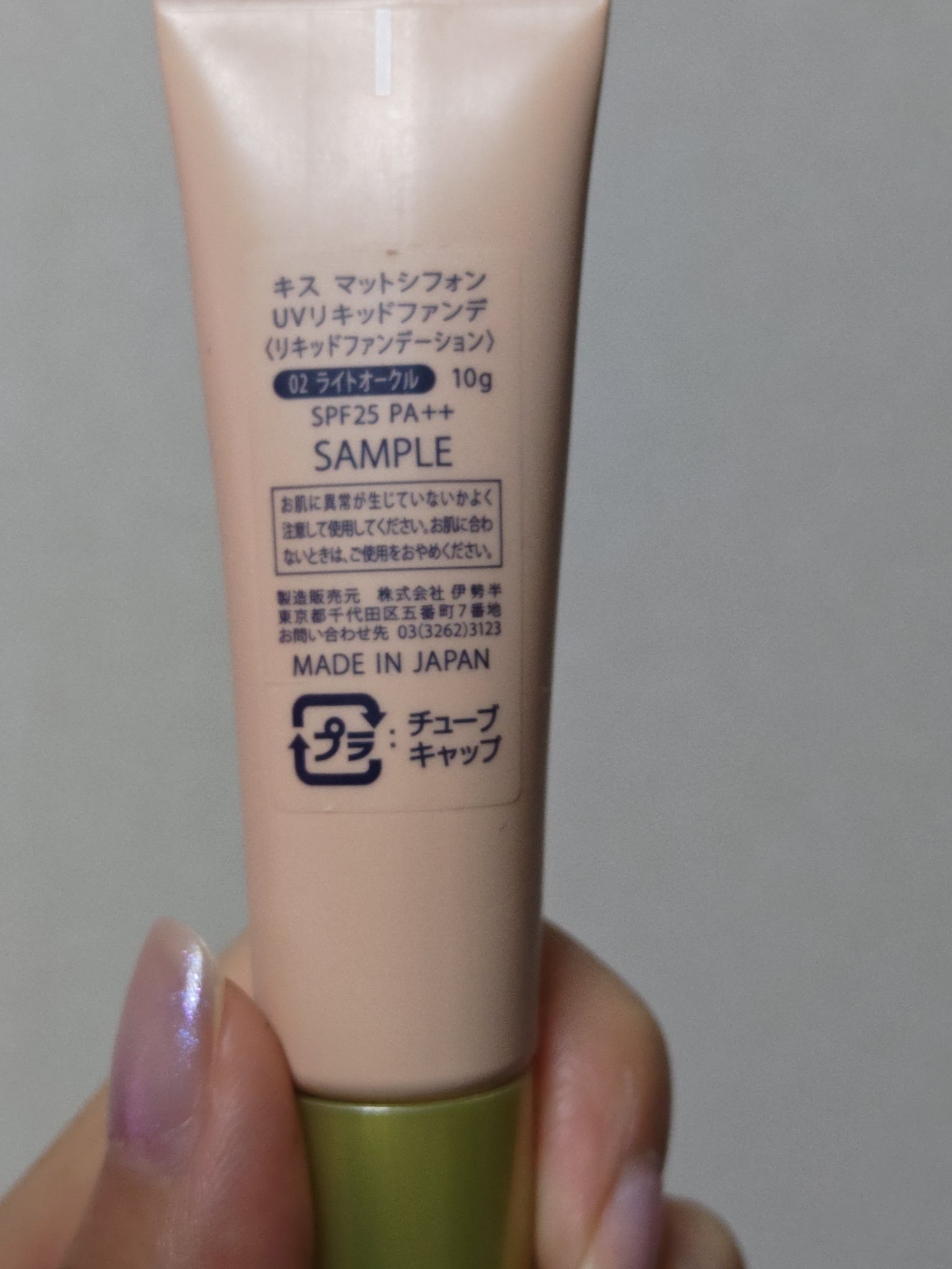 KiSSマットシフォンUVリキッドファンデライトオークル ¥1,980こちらもサンプル!少量でも伸びが良く、カバー力もある!!薄いシミとかならコンシーラーいらないくらい!塗ってすぐピタッと密着してくれてこちらもニキビのもとになりにくい処方みたい!#肌荒れ予防計画#ファンデーション#キスマットシフォン#ベースメイク#kiss