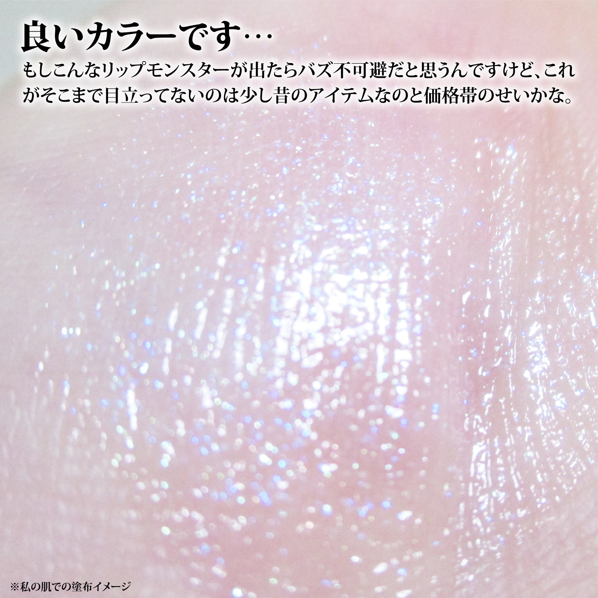 塗り心地は滑らかで此方もリップモンスターと近い質感、ラメの粒感はやや有り 単体だと色は無く、上から色を混ぜるというよりラメの輝きでニュアンスや色味を変化する GD-01だとゴールドの輝きや存在感が出やすくPT-01だと透明感でラメの存在感は控えめ