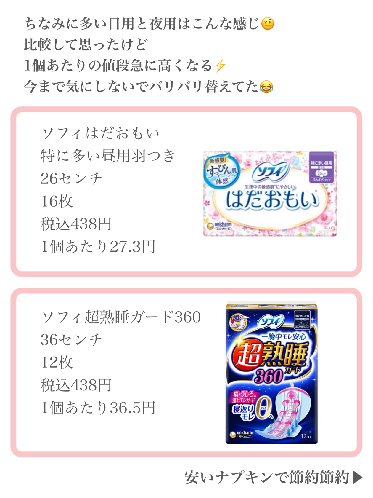 妊娠出産を経て久々に生理が来たときドラストに行って本当にびっくりした!せ、生理用品の値上げがえげつない…😂このご時世仕方ないのは分かっているけど生理用品1つ買うのに500円近くって…金額間違ってません?って本気で店員さんに聞こうかと思いました😅今日は生活するだけでもお金がかかってしょうがないわたしたち…少しでも生理用品を節約したいがためにわたしが行っている方法や役立ちアイデアをご紹介します🫶もう皆さん知らず知らずのうちにやっているかもしれませんが…笑※経血の量やかぶれやすさなど人それぞれですし、不衛生だと思う方もいらっしゃると思うのであくまで参考程度にお願いします🙇♀️あと羽ありユーザーです🪽ではまず安ナプキンの金額比較お値段はドラストで見てきました〜🌼エリス新•素肌感 羽つき20.5センチ20枚×2個税込283円1個あたり7.0円🌼エリス新•素肌感 羽なし20.5センチ26枚×2個税込283円1個あたり5.4円🌼ソフィボディフィット羽つき21センチ20枚×2個税込327円1個あたり8.1円🌼ソフィボディフィット羽なし21センチ28枚×2個税込327円1個あたり5.8円🌼ロリエ肌きれいガード羽つき20.5センチ20枚×2個税込283円1個あたり7.0円🌼ロリエ肌きれいガード羽なし20.5センチ28枚×2個税込283円1個あたり5.0円 ちなみに多い日用と夜用はこんな感じ🤨👇比較して思ったけど1個あたりの値段急に高くなる😂🌼ソフィはだおもい特に多い昼用羽つき26センチ16枚税込438円1個あたり27.3円🌼ソフィ超熟睡ガード36036センチ12枚税込438円1個あたり36.5円それでは節約術とお役立ち情報👇節約術❶多い日用は2.3日目に外出するときのみシンクロフィットもどきをおしりに挟め外出するときはもし万が一の時のために多い日用をつけますが、家にいるときは基本20センチくらいの安いナプキンで過ごしています🙂わたしは結構後ろ漏れをしてしまうのでそんな日はトイレットペーパーでシンクロフィットもどきを作っておしりの割れ目に挟んでいます🍑笑ただこのシンクロフィットもどき…トイレに座ったときおしりに張り付いたままなので毎回手で取って新しく作り直して挟み直さないといけないのがデメリット🤨節約術❷夜は安いナプキン2枚重ねとシンクロフィットもどきで漏れ安心🫶前は2.3日目は夜用ナプキンを使っていましたが、正直夜間トイレに目覚めたとき、後ろ真っ白なのに替えるのもったいなくないですか?笑なので安いナプキンを2枚重ねて夜間トイレに起きた時は汚れたところだけ変えています👍朝まで後ろのナプキンがきれいなときは朝使っちゃいます🤤夜は後ろ漏れが心配なので鮮血が出ている間は夜にシンクロフィットもどきをおしりに挟んでいます🍑スパッツ履くのも忘れずに!役立ち情報❶使用済みのナプキンニオイ漏れを軽減する包み方前は普通に羽をたたんでから縦方向にクルクルして包んで捨てていましたが、これだとよごれが見えちゃうし、ニオイも気になりますよね😅なので先に上下を羽サイズに折りたたんでから、羽を縦方向にしてくるくるします!(説明がわかりづらいので次のページで動画にしました😅)羽の粘着を利用して密閉しちゃえば汚れが見えないしニオイも軽減!役立ち情報❷サニタリーボックス紙袋でいいじゃんゴミの日にサニタリーボックスを捨てる作業、正直苦手なんですよね😅苦手すぎてゴミの日に忘れちゃうことが多くて、サニタリーボックスやめよってなって最初は生理の時だけ黒い袋を直置きしていたんですが、捨てるとき開けて結ぶ作業がいちいち面倒くさくなってついに紙袋にしちゃいました😙そうすれば開け閉めも楽だしゴミの日にポイです🖐️箱のサニタリーボックスも売っていますが使っているのは100均の安い紙袋です✨18枚入りなのでコスパもいい!トイレットペーパーもナプキンももう少し安くなればいいんですけどね〜コスメ買いたいのにお財布が痛い🥲節約節約ー!と思ってあまりナプキンを替えないでいるとかぶれたり膀胱炎になったりろくなことないのでちゃんとトイレに行くたびに替えましょう🫶膀胱炎は痛いしきついですよ🖐️😱紙袋はわたしは無地だったけどかわいい柄の袋とかにして毎月変えるのも気分が少し違っていいかも😙以上になります!ご覧いただきありがとうございました🙇♀️#生理#ナプキン#シンクロフィット#節約#ロリエ#ソフィ#エリス