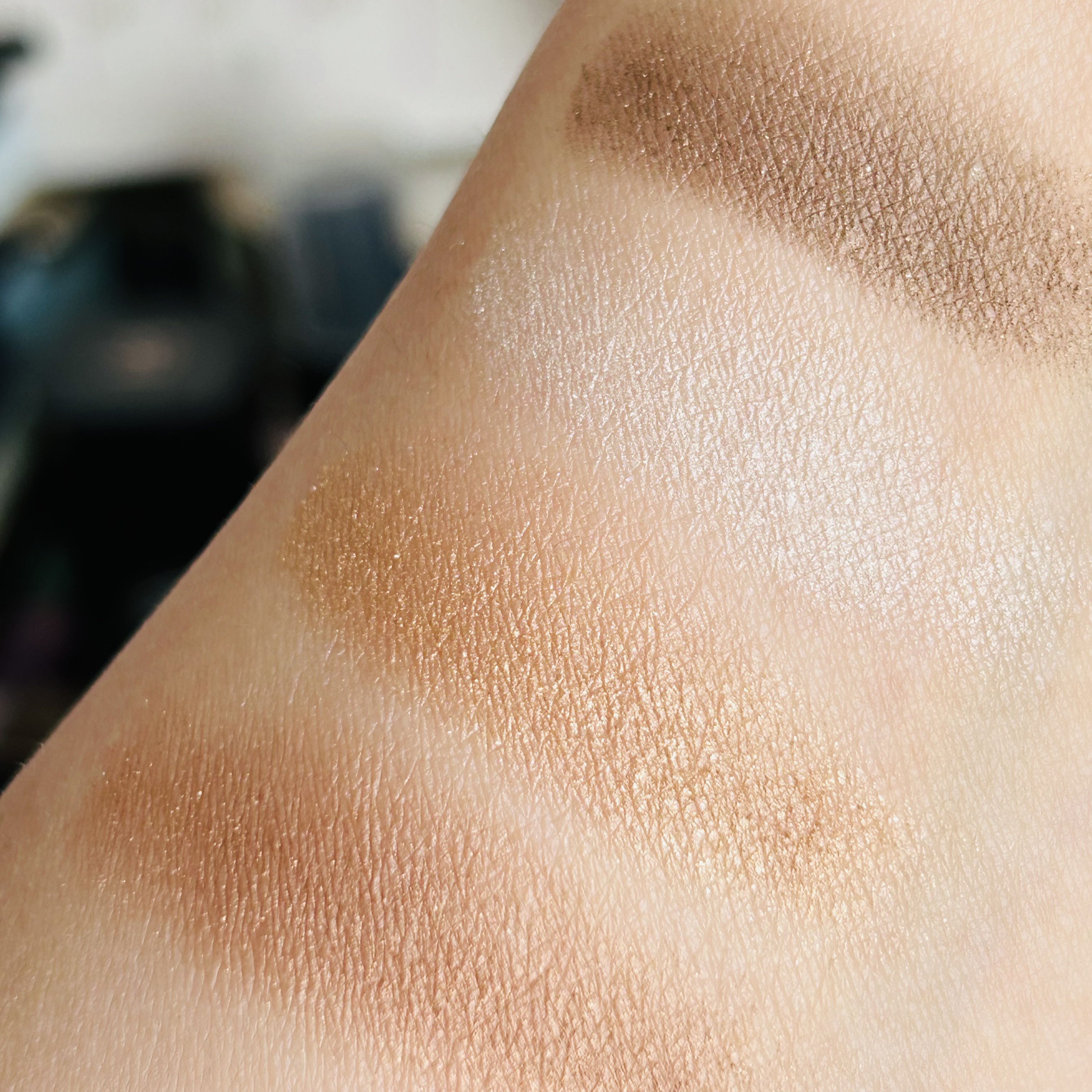 プチプラなのに粉質しっとり、発色も良く肌馴染みも良い捨て色なし4色パレット🎨 どのカラーも強いカラーのものがないので、ナチュラルメイク好きな方にもオススメな感じ💁♀️ スウォッチをしたことでますますメイクをするのが楽しみになるパレット!