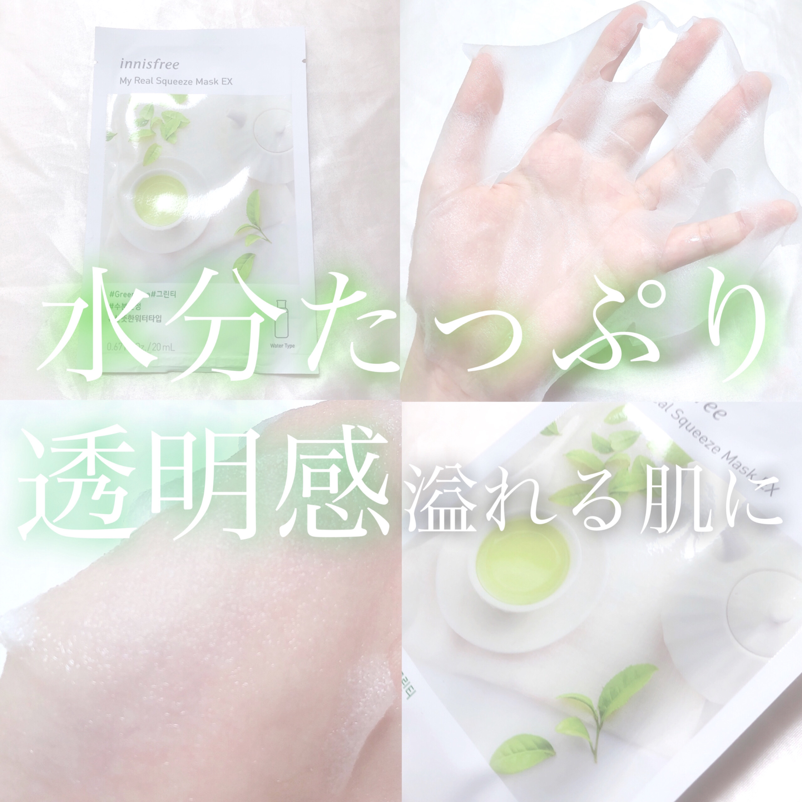〇innisfreeマイリアルスクイーズマスクシートEXGT1枚入り(20ml)150円+税グリーンティーエキスがたっぷりの潤いを与え、なめらか肌に導く、爽やかなウォータータイプのマスクシートInnisfreeのこちらのシートマスクはさっぱり...