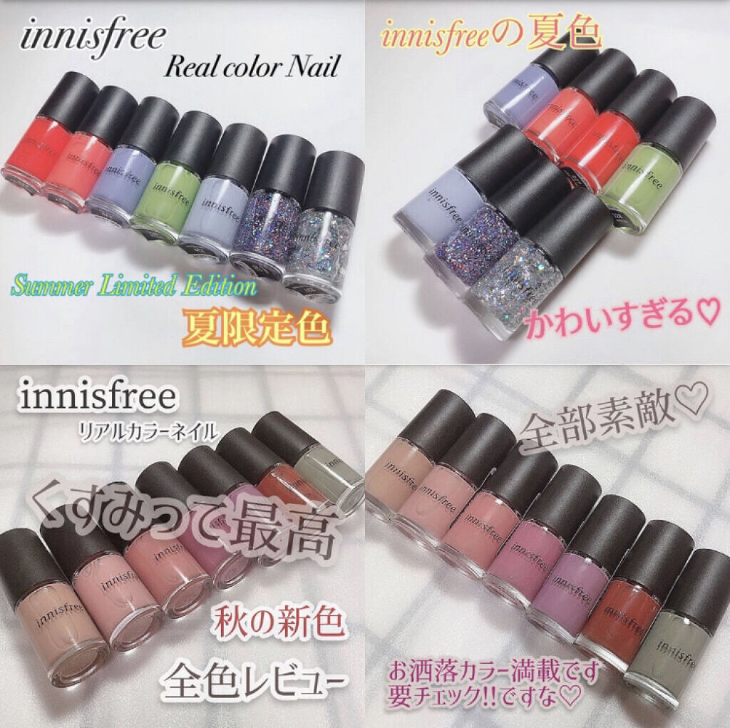 はぁ😍💕激カワすぎる✨innisfreeリアルカラーネイルサマーエディション🌴☀️夏限定カラーです♡全7色各6mL各440円で(税込)私は2本セットで840円で購入。(Qoo10)見るだけでも涼しく楽しくなるようなビビットカラー&キラキラ光る...