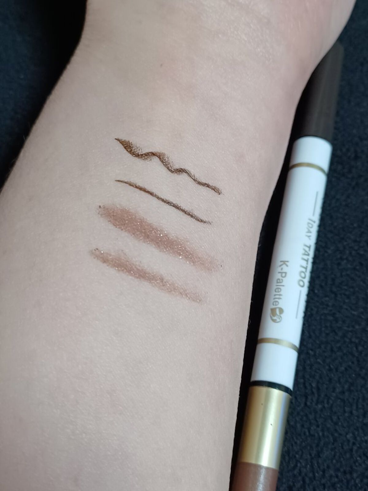 K-Paletteエッセンスインシャドウライナー02ブラウンブラック×キャメルブラウン発色はいいんですけどテクスチャーがゆるくて乾くのが少し遅かったです…😂筆が広がりやすいのが難点でした(−_−;)...