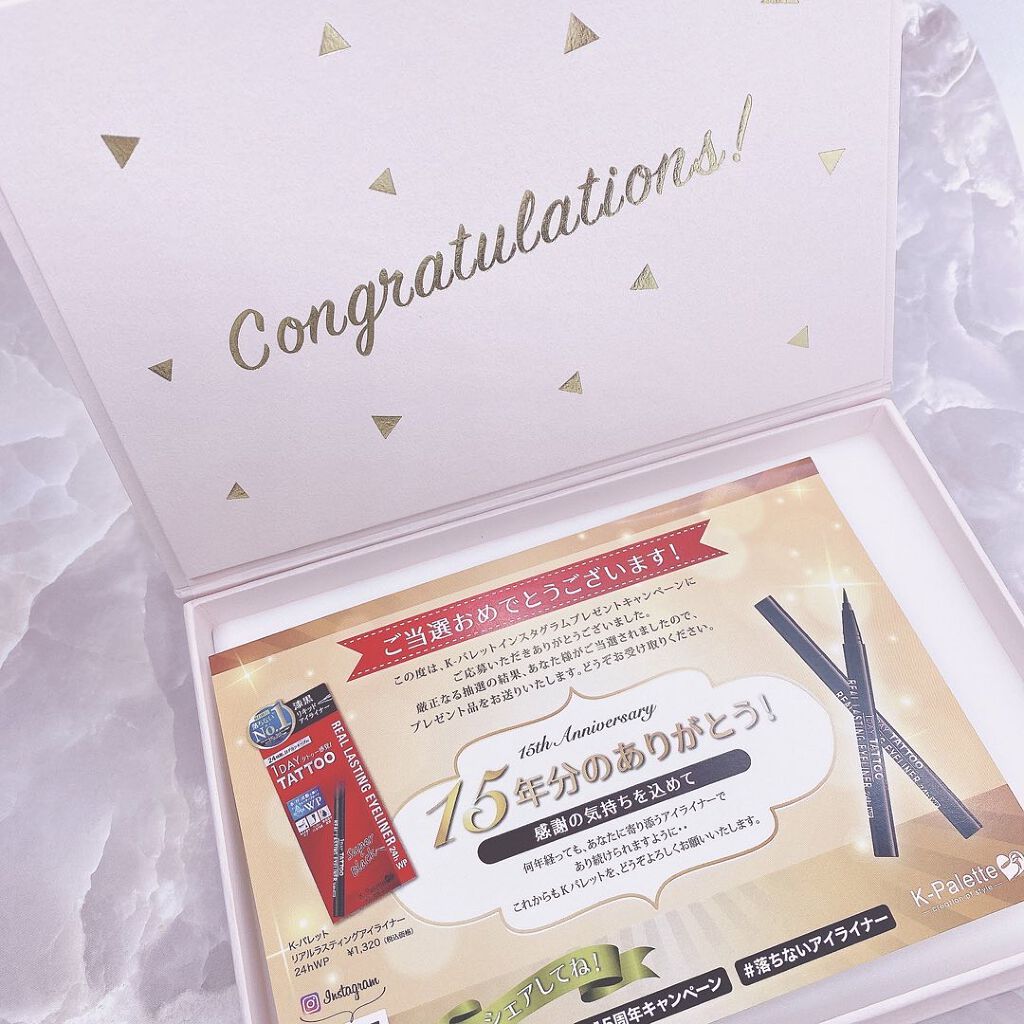 .⋆⸜15周年のK-パレットアイライナー✨⸝⋆ K-パレット(@kpalette_jp)様よりキャンペーンでアイメイクボックスを頂きました🥰\ありがとうございます💕/Kパレット様のアイブロウパウダーとリキッドが一つになった"ラスティング2WAYアイブロウリキッドWP"を普段から使っているのですが、ナチュラルに眉が仕上がるので気に入ってます✨使いやすいアイテムが多く、コスパの良いアイテムも多いので毎日のメイクに欠かせないブランドになってる人も多いのでは⁈と思います😘頂いたプレゼントボックスの中には...🥳♡1DAYTATTOOプロキャストザ・アイライナーダリアパープル♡ラスティングアイブロウマスカラナチュラルブラウン♡ラスティングリップティントスティックジューシーレッド豪華な3点セット嬉しいです🙌💕パープル系のアイライナー使ってみたかったので楽しみです🥰安定の描きやすさです✨アイブロウマスカラもちょうど終わってしまったので、さっそく使ってみようと思います✨⋆ ꙳⋆ ꙳⋆ ꙳⋆ ꙳⋆ ꙳⋆ ꙳いつもイイネ&フォロー頂きありがとうございます♡@cosme_t07美容アカさんフォロバさせて頂きます♡フォロー頂けたら嬉しいです♡⋆ ꙳⋆ ꙳⋆ ꙳⋆ ꙳⋆ ꙳⋆ ꙳#Kパレット#15周年キャンペーン#落ちないアイライナー#コスメ好き#コスメ大好き#美容大好き#コスメの好きな人と繋がりたい#美容好きな人と繋がりたい#コスメオタク#美容好きさんと繋がりたい#美容垢#美容垢さんと繋がりたい#コスメコンシェルジュ#コスメ情報#コスメレビュー#美容情報#コスメ購入品#コスメ好きさんと繋がりたい#フォロバ100#followforlike#likeforlikes#メイク好きさんと繋がりたい#美容アカ#美容オタク#美容マニア#美容垢フォロバ#美容垢さんフォロバします