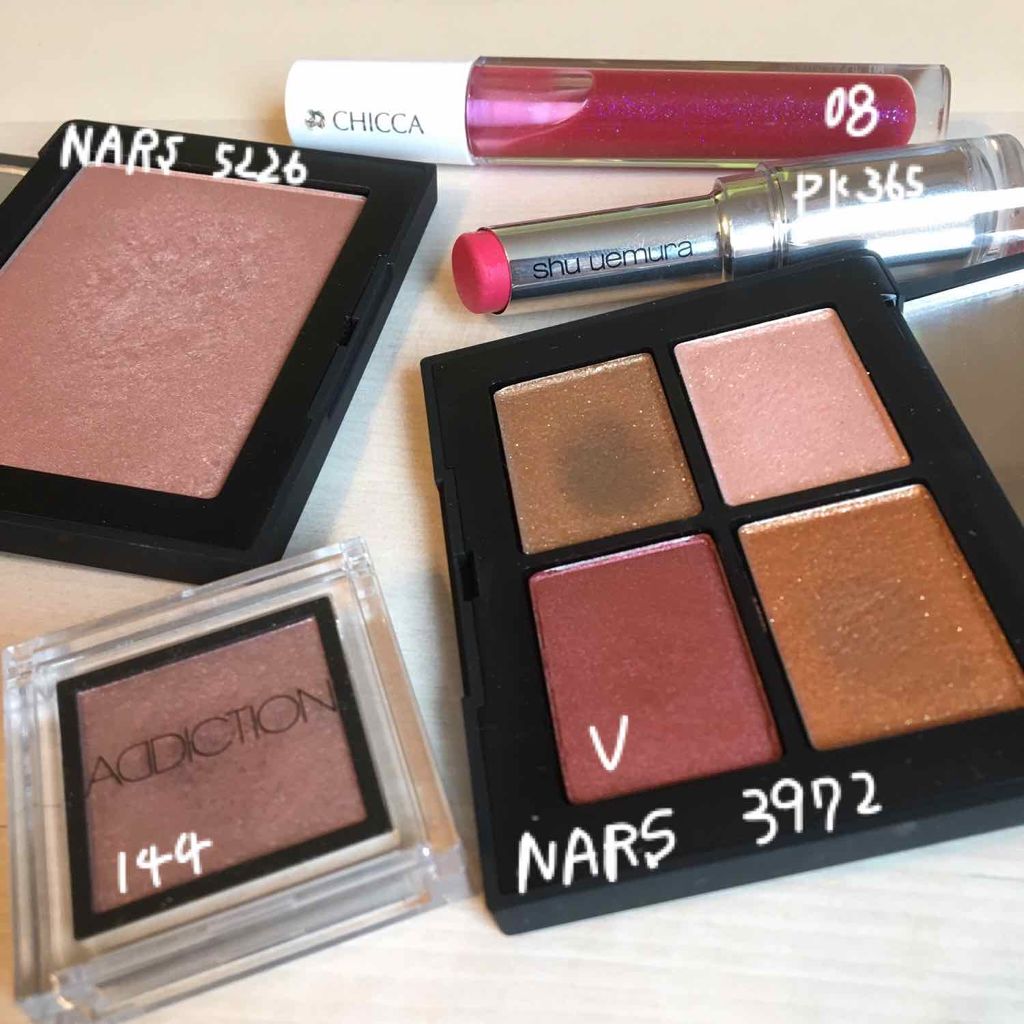#今日のメイク🎀#ADDICTIONザアイシャドウ(144ヴィンテージローズ)🎀#NARSクワッドアイシャドー(3972シンガポール)🎀#NARSハイライティングパウダー(5226ローズブロンズ)🎀#シュウウエムラルージュアンリミテッド(PK365)🎀#CHICCAメスメリックグラスリップオイル(08ダークアップル)アディクション144で全体を整えて、NARSのクワッドの赤を目尻に入れる!2色だけで作るアイメイクです。アディクションはくすみ感あるローズカラーで、NARSは錆びたような赤。どっちもおしゃれなカラーで合わせると可愛い目元を強めたのでリップは可愛く!シュウのピンクの上にCHICCAのグロスを重ねて艶とラメを#アディクション#ナーズ#shuuemura#キッカ#メイク#コスメ#makeup#cosmetics#コスメブログ#コスメ垢#コスメレポ#コスメレビュー#コスメ紹介#コスメ好き#メイク好き#アラサーメイク#大人メイク#コスメ好きさんと繋がりたい#一重メイク#メイク好きな人と繋がりたい#デパコス#メイク写真