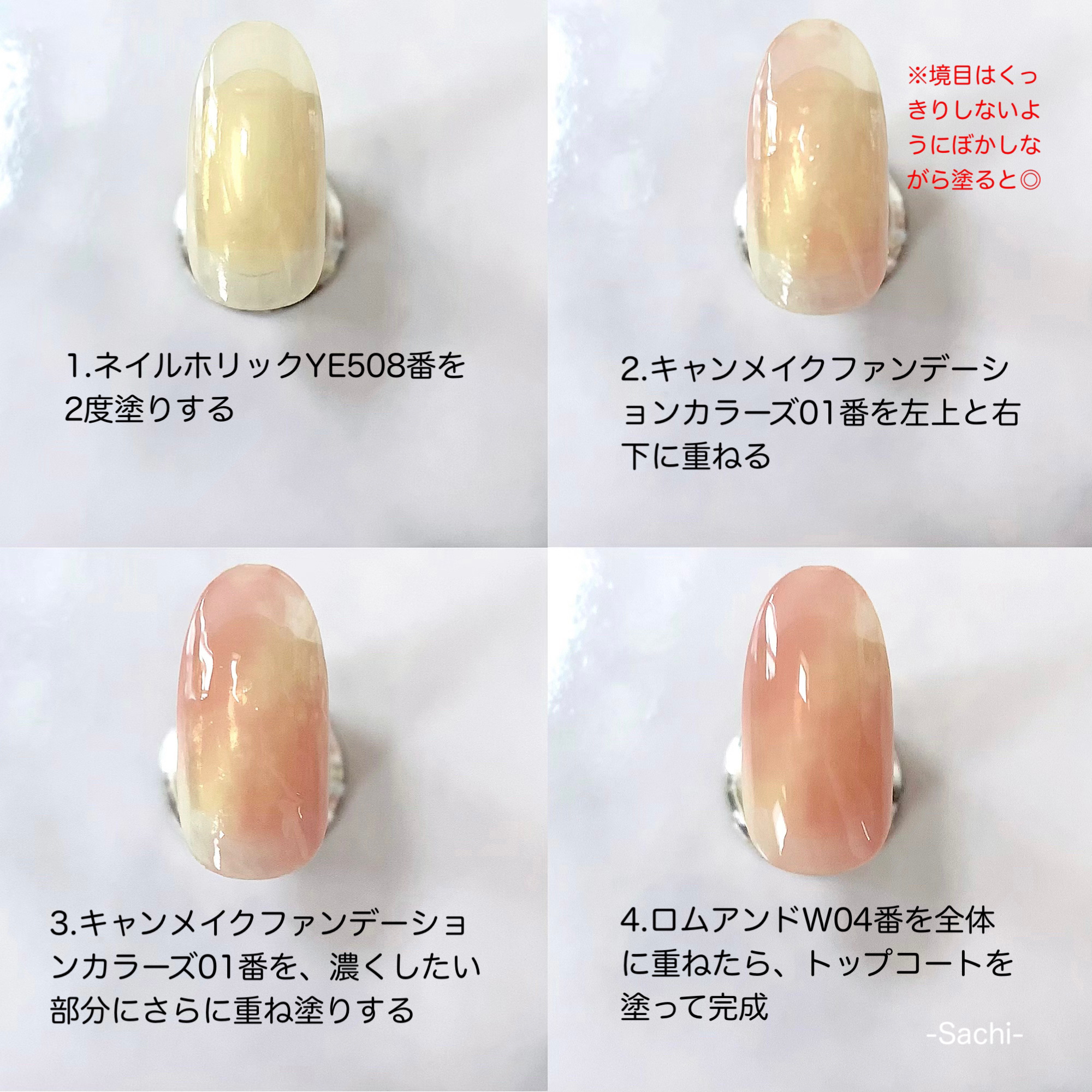 やり方は画像を参考にしていただければと思います♡ ファンデーションカラーズ01番を重ねる時は、境目がくっきりしないように、トントンと軽くぼかしながら塗ると良いです🙆♀️ ムラになっても全然OKです👍 人差し指と小指はW04番を2度塗りしました🙌
