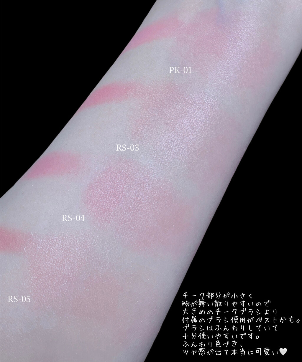 このチークはブルベが泣いて喜びそうなローズピンク系がめっちゃ豊富😍 もちろんイエベさん向けカラーもあるけどこんなにたくさんのローズカラーが揃ってることってあまりないから小躍りしてしまう~(´∀︎`~)♪︎ ♬︎ 全色微細なシルバーパール入りでツヤ感バッチリなふんわり可愛い頬に仕上げられます♪
