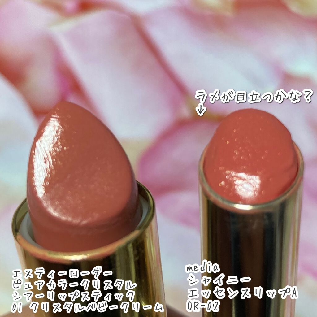 メディアのシャイニーエッセンスリップOR-02!!エスティーローダーピュアカラークリスタルシアーリップスティック 01クリスタルベビークリームに似ていると一時期話題でしたよね!!コスメ整理していて出てきたので比べてみました!ちょっとエスティの...