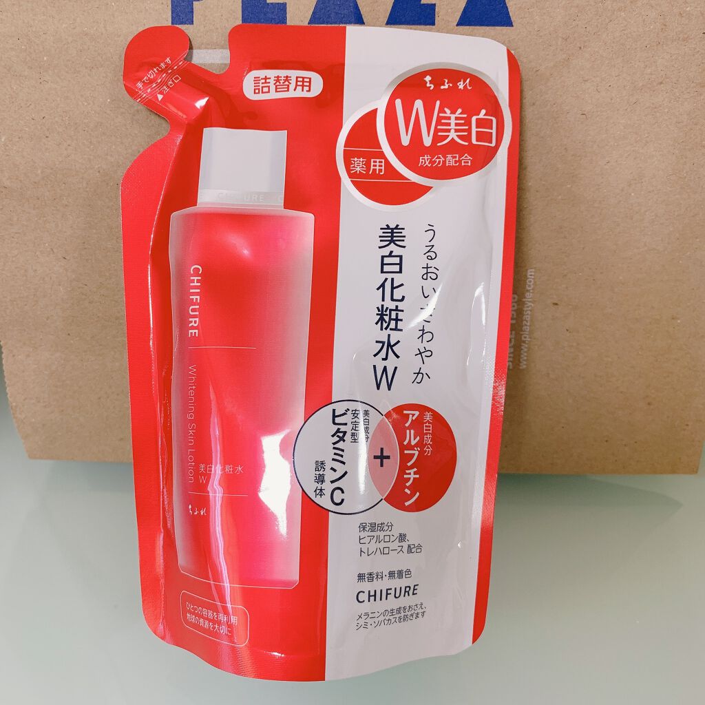 ちふれ美白化粧水W詰替用180ml1,000円〈成分〉アルブチン安定型ビタミンC誘導体配合ヒアルロン酸トレハロース〈特徴〉メラニンの生成をおさえ、シミ、ソバカスを防ぎます。無香料・無着色・ノンアルコールタイプ〈感想〉低刺激で肌が少し荒れていて...