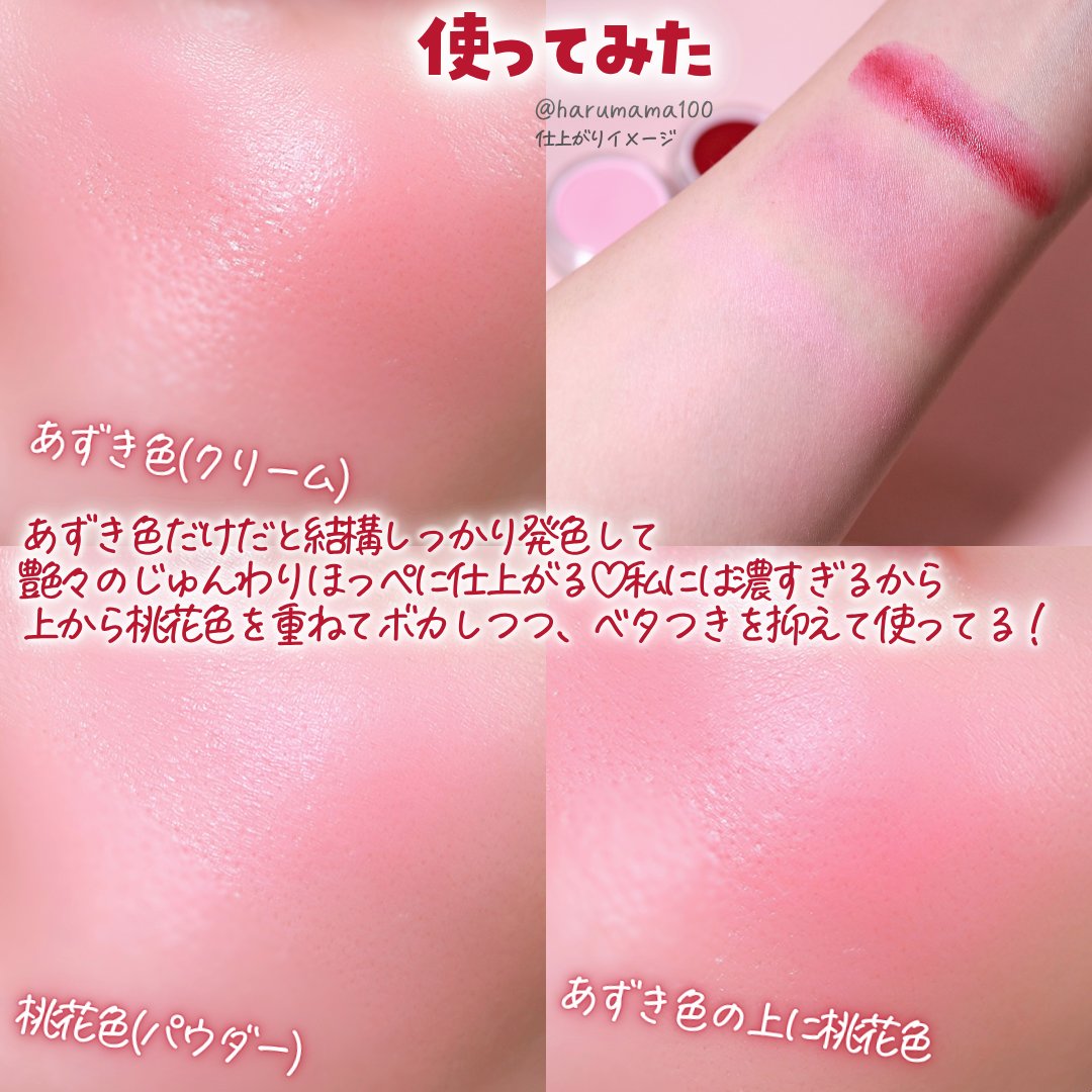 【クリーム&パウダーの哀愁デュアルチーク♡】重ね塗りを楽しめる2質感のチーク♪深いレッドの”あずき色”はクリーム、キュートなピンクの”桃花色”はパウダーがセットになっているよ。にじみでるような、じゅんわり血色感がすごく可愛いの…!!レッドはけ...