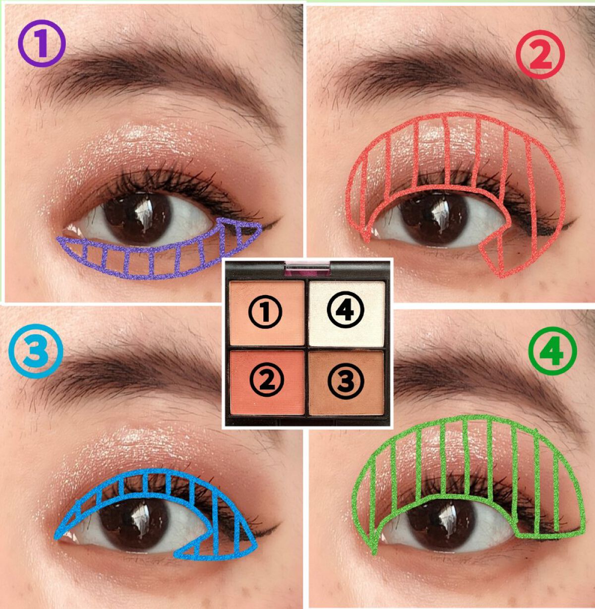 化粧下地は、CEZANNE 皮脂テカリ防止下地 保湿タイプ オレンジベージュを、顔全体にまんべんなく塗ります。 ファンデーションは、RMK ジェルクリーミィファンデーション 103を、顔全体にまんべんなく塗ります。 チークは、M・A・C ミネラライズ スキンフィニッシュ ソフト & ジェントルを、両頬に塗ります。 アイブロウパウダーは、CEZANNE ノーズ&アイブロウパウダー 01 キャメルを、眉毛全体にまんべんなく塗ります。 アイシャドウパレットは、LUNASOL ジェミネイトアイズを、使用します。 アイライナーは、ラブフロー クチュールライナー フォーアイを、塗ります。 マスカラは、ラブフロー スクラビング ブラッシュ マスカラを、まつ毛全体にまんべんなく塗ります。 リップは、REVLON スーパー ラストラス リップスティック 205 ローズ アンド シャインを、唇全体にまんべんなく塗ります。