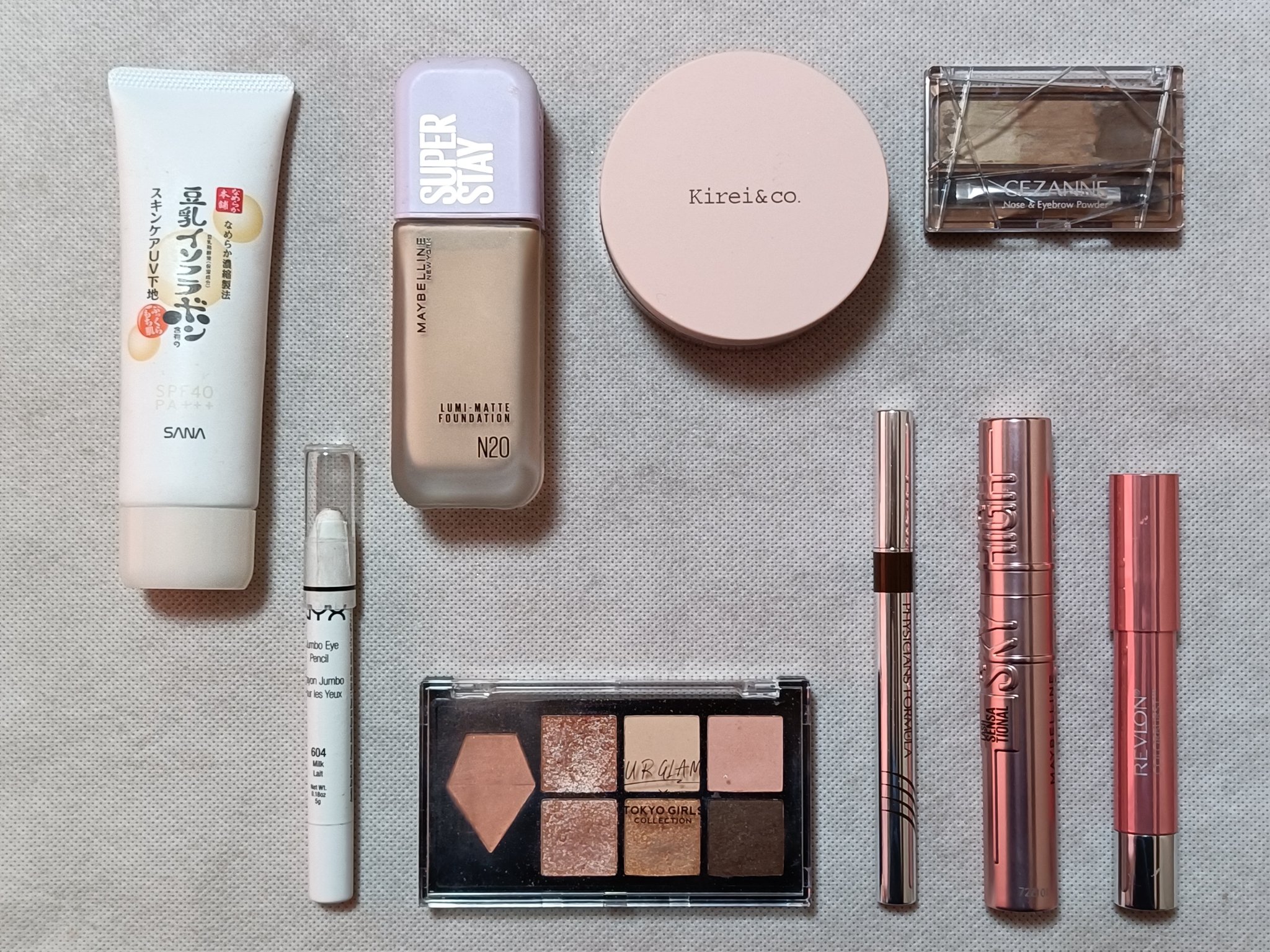 アリィー クロノビューティ ミルクUV EX 上下左右によく振ってから顔全体に塗布する。 RMK ジェルクリーミィファンデーション 103 顔全体に塗布する。 ちふれ ルース パウダー 1 ルーセント 顔全体に軽くのせる。 Milani Cosmetics MILANIイルミネーティングフェイスパウダー 両頬に濃いめに広めにのせる。 ちふれ アイブロー パウダー PK10 ピンク系ブラウン しっかり眉になるように濃いめにかく。 インハート パーフェクトリッチアイシャドウ 03 ウォームブラウン メインのアイシャドウパレット。 ちふれ リキッド アイライナー 筆ペンタイプ BK30 ブラック 目尻から外側に向かって長めにかく。 MAYBELLINE NEW YORK スカイハイ 01 まつ毛全体に塗布する。 REVLON カラーバースト ラッカー バーム 15 デミュア 唇全体にオーバー気味にしっかり塗布する。